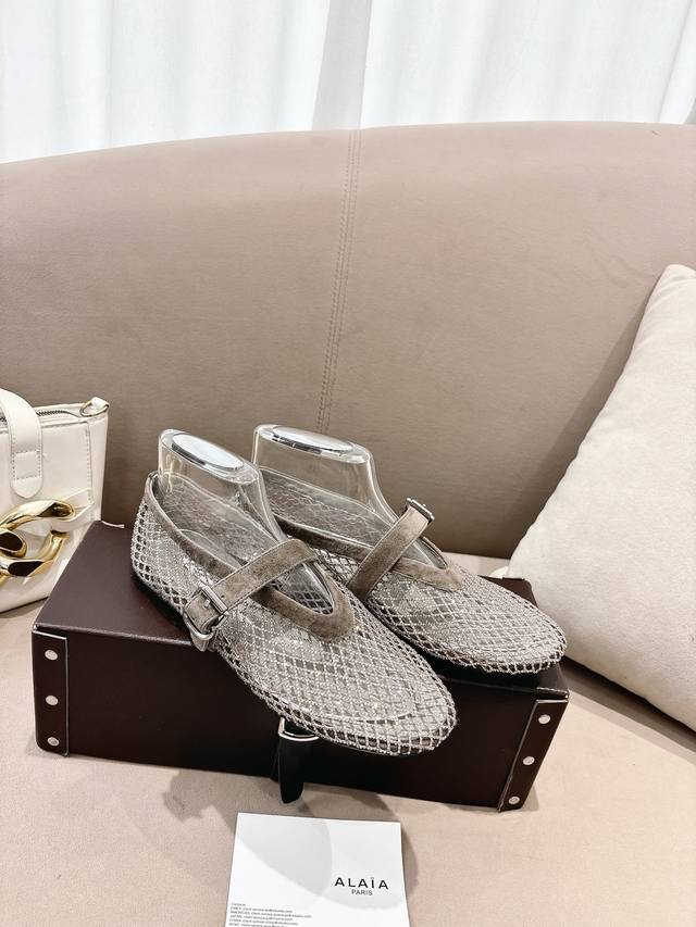 / 2026 春夏Alaia 镶钻渔网芭蕾鞋 DDD Alaia这款镶钻渔网芭蕾鞋,麂皮+渔网编织,点缀上千施华洛世奇水钻,银河繁星感超梦幻!经典玛丽珍鞋型,一字扣