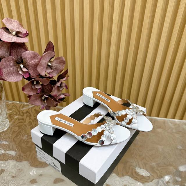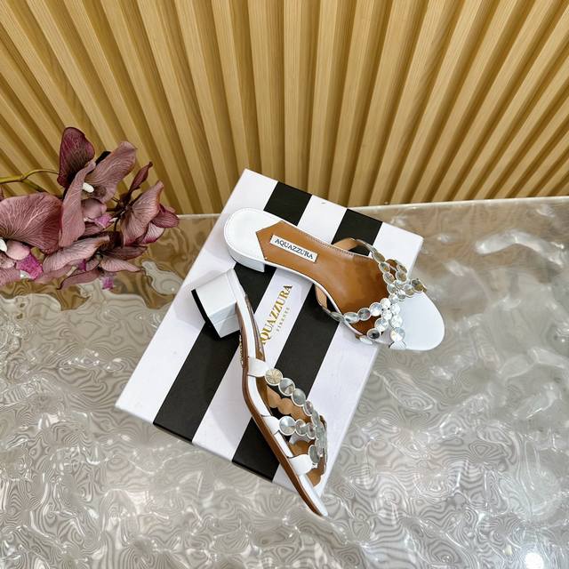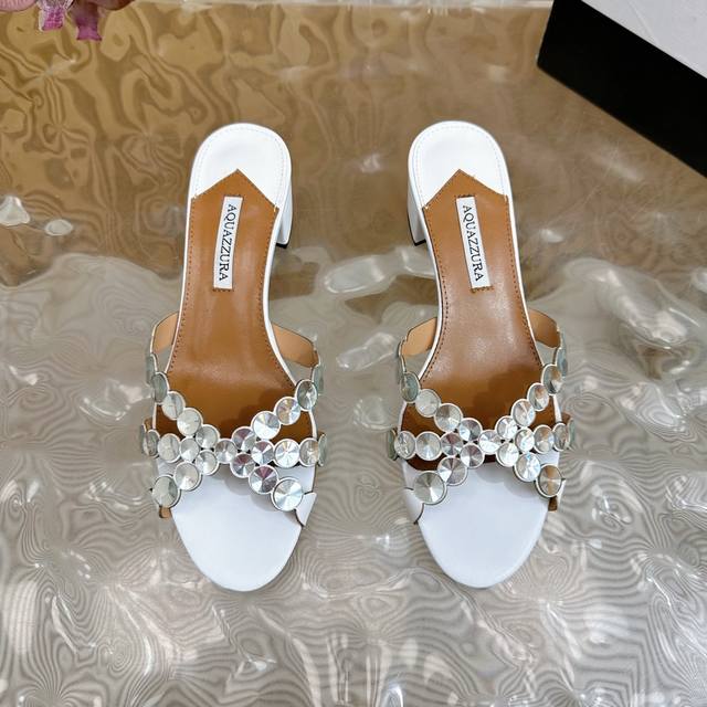 Aquazzura 新款顶级版本 菠萝女士扭花钻面拖鞋 粗跟凉鞋原版1比1开模鞋跟!闪耀光芒 进口羊皮搭配原版开模鞋跟,简单大方 .使鞋子更有女人味,适合派对的