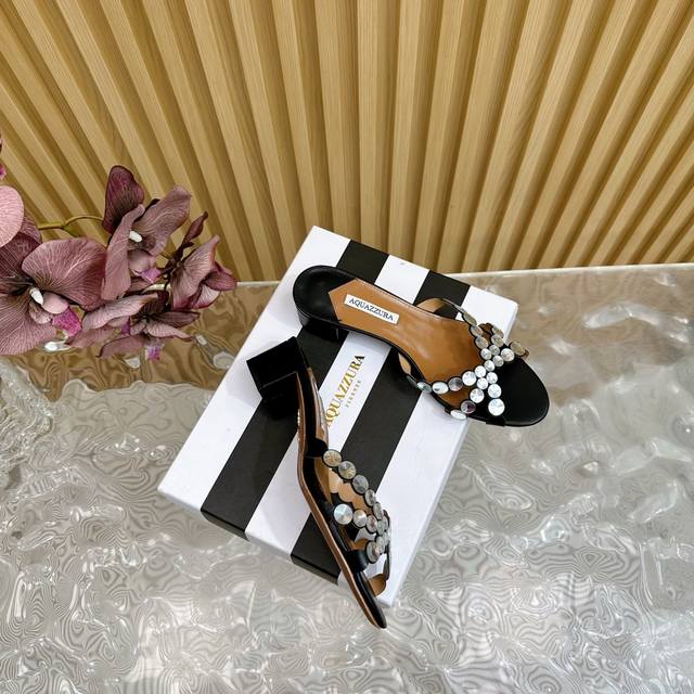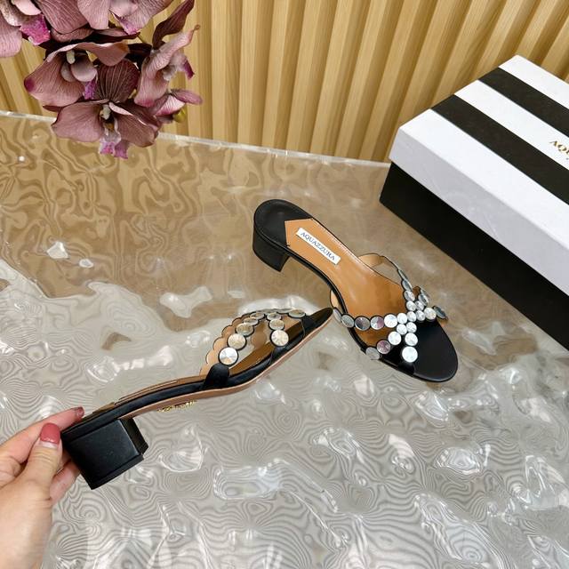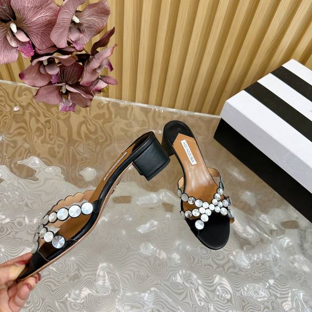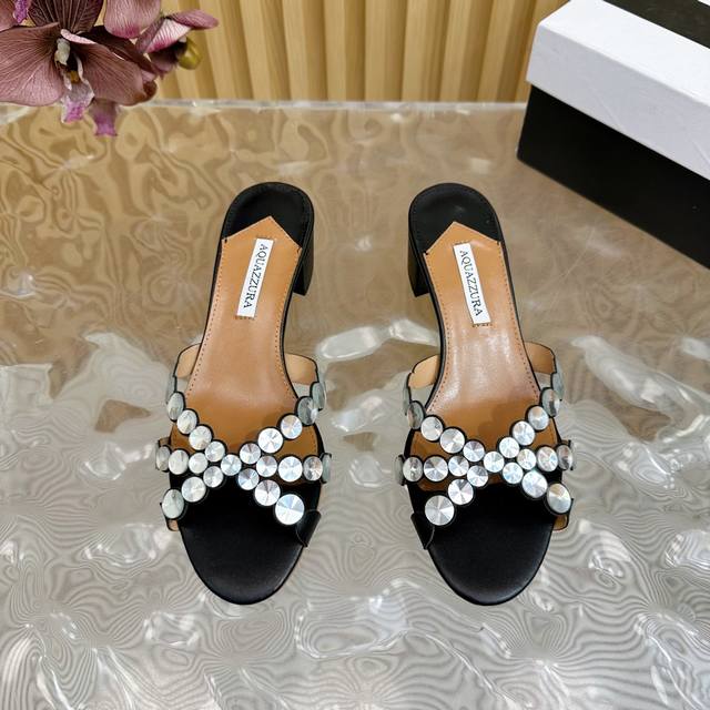 Aquazzura 新款顶级版本 菠萝女士扭花钻面拖鞋 粗跟凉鞋原版1比1开模鞋跟!闪耀光芒 进口羊皮搭配原版开模鞋跟,简单大方 .使鞋子更有女人味,适合派对的