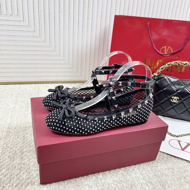 Valentino华伦天奴2025Ss新款 Vt蝴蝶结芭蕾舞鞋 网面烫钻平底单鞋
