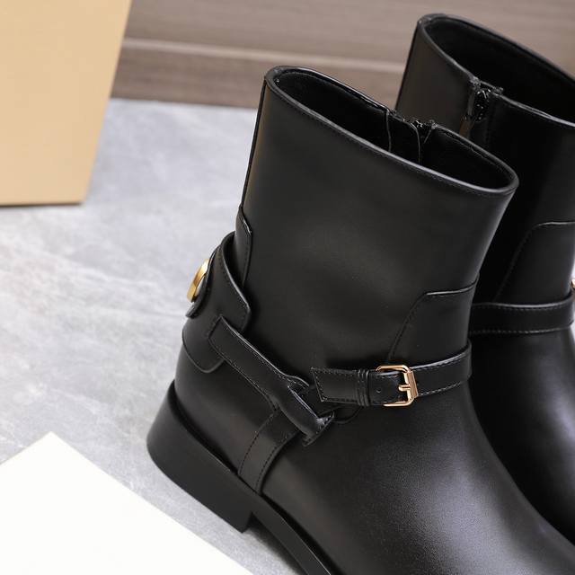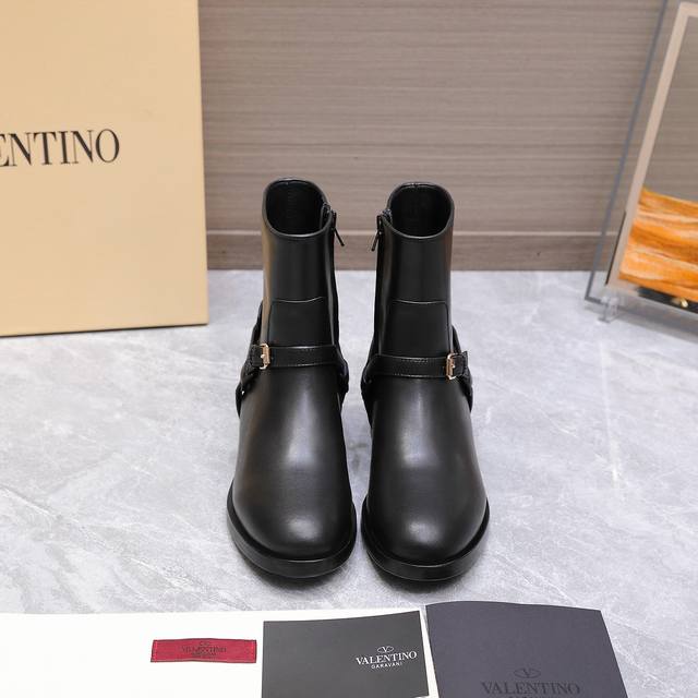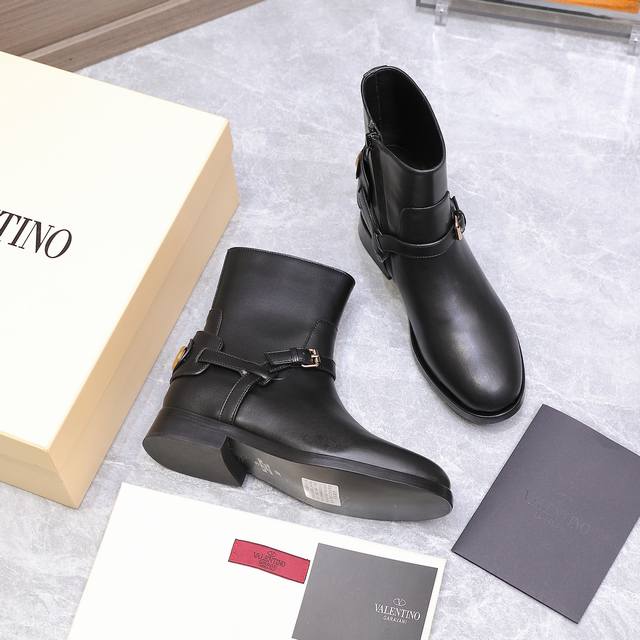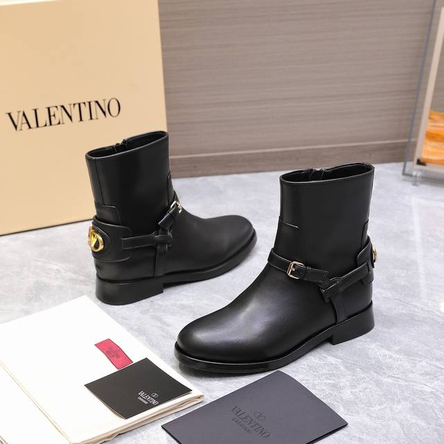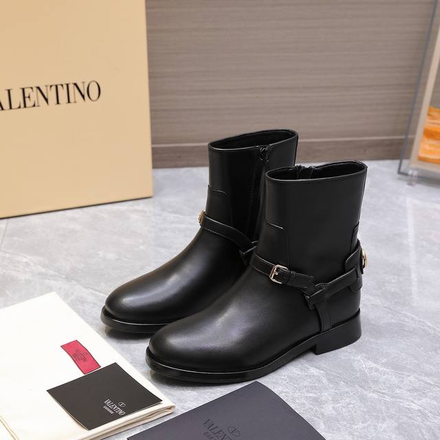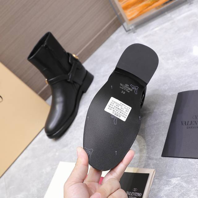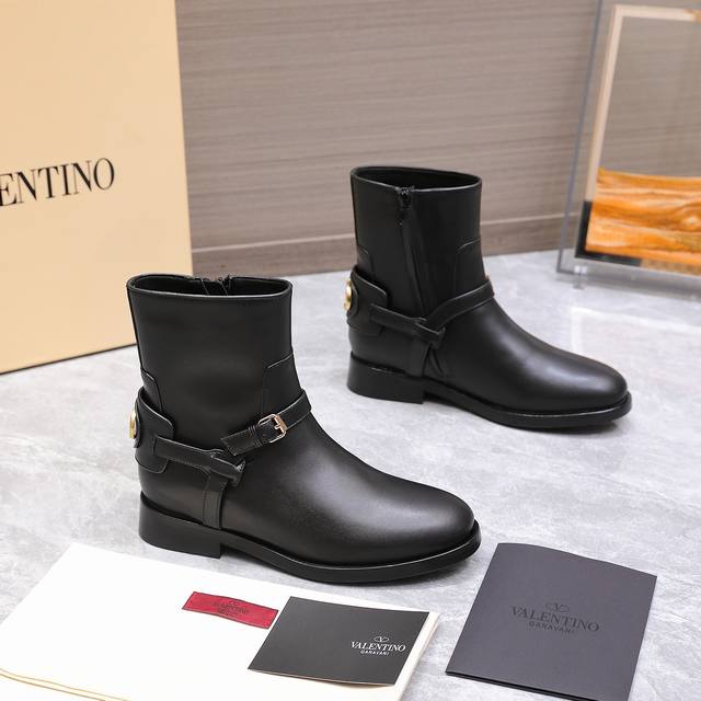 代购级 25Ss 秋冬新款 华伦天奴Valentino 圆头 V扣骑士短靴 华伦天奴专柜最新款 顶级版本 绝对史上最强货 欢迎对比大底采用意大利进口真皮大底 舒