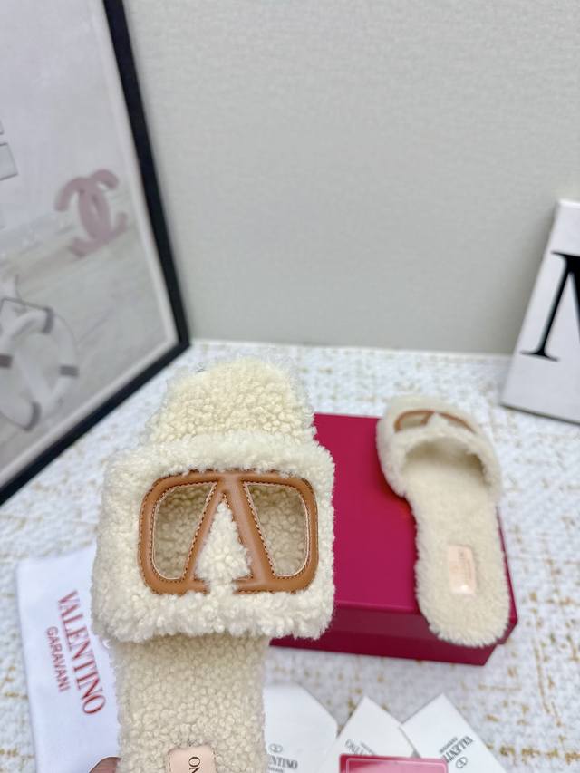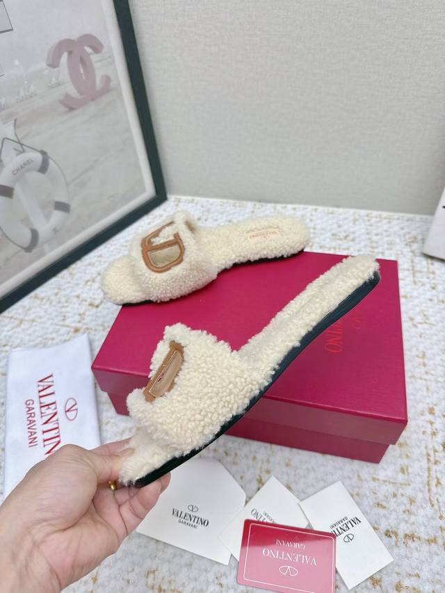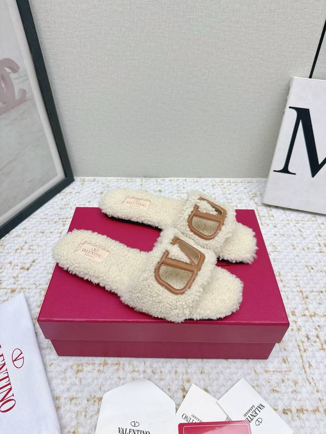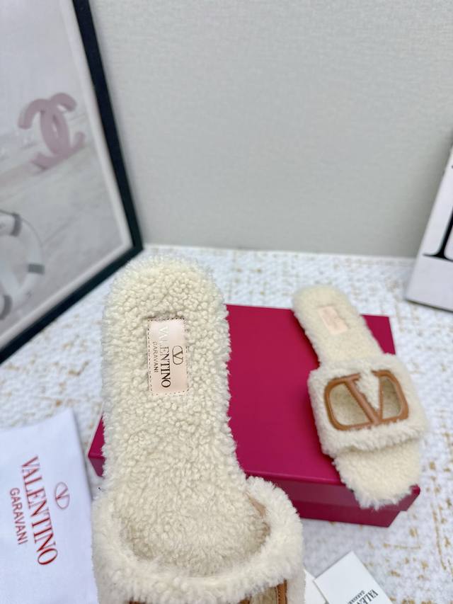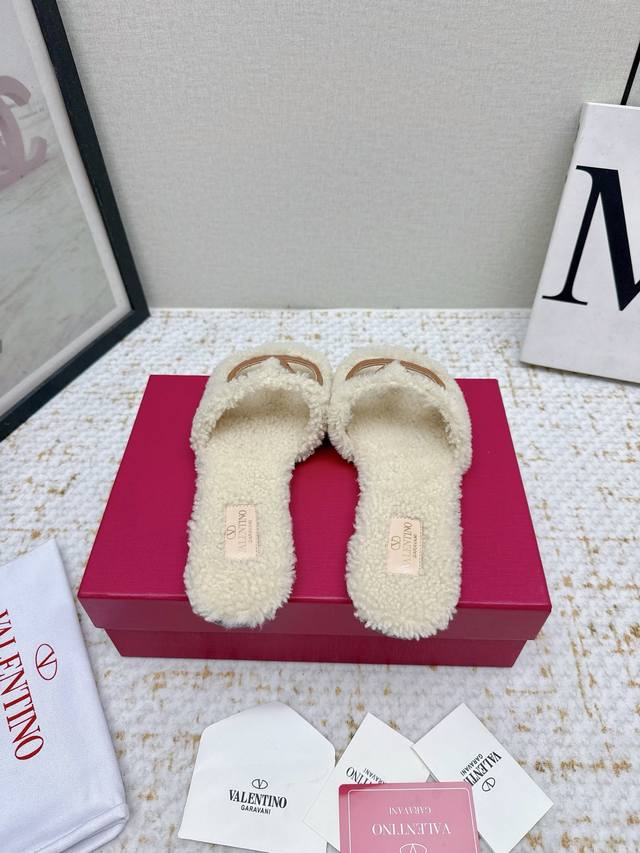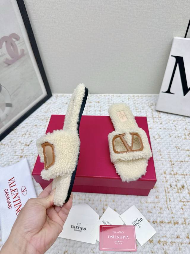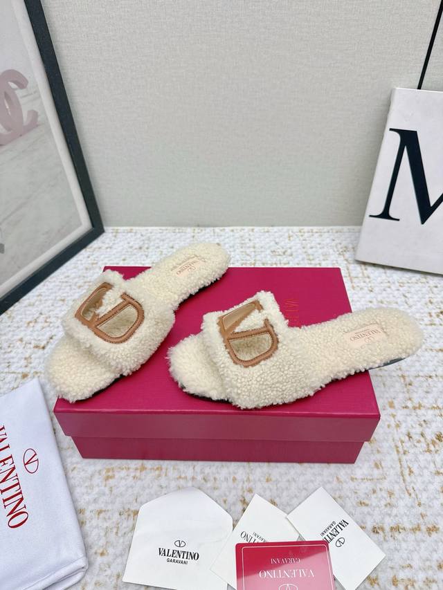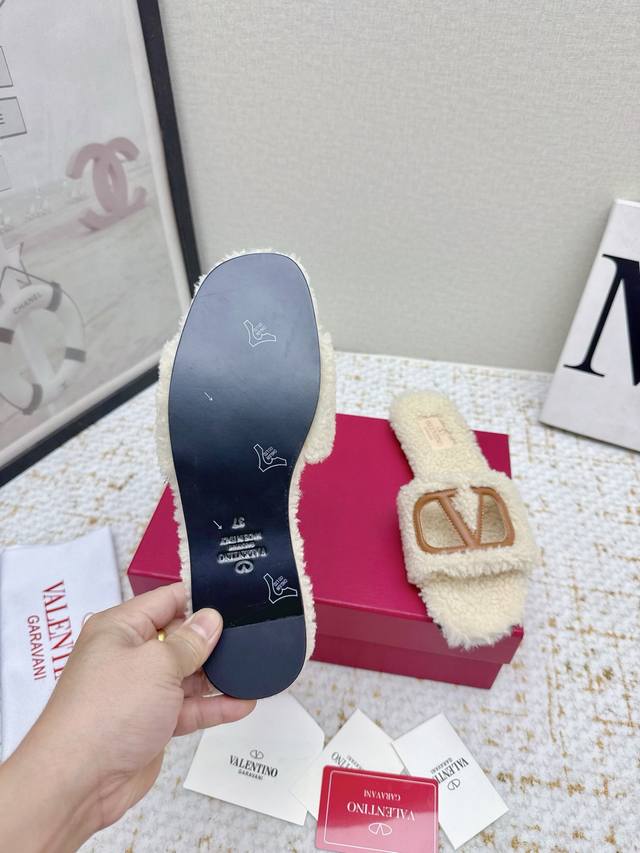 / 出厂 高版本 Valentino华伦天奴镂空2025最新款毛拖平底拖鞋。鞋面3D压制大Logo V家品牌标识。网红热款。软乎乎的羊羔毛吸汗防滑,脚底爱出汗的姐妹
