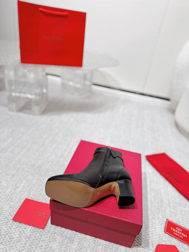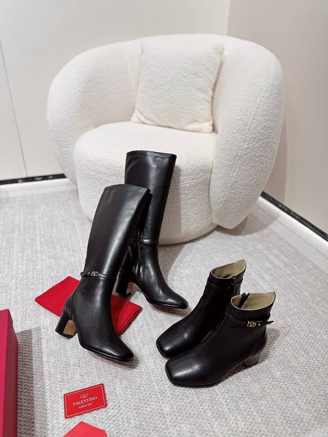 短靴: Valentino华伦天奴高版本粗跟镂空V标 不过膝 机车靴!原版复刻. 高端大气上档次!上脚舒适奢华. 材质:鞋面全牛皮. 内里全牛皮. 进口高密度意