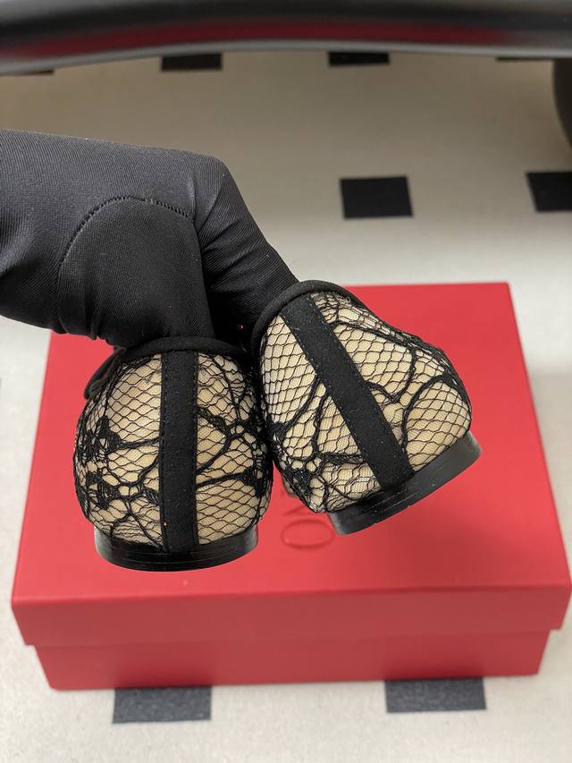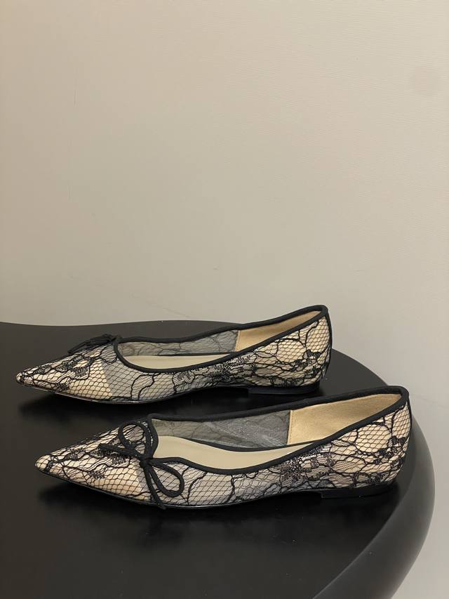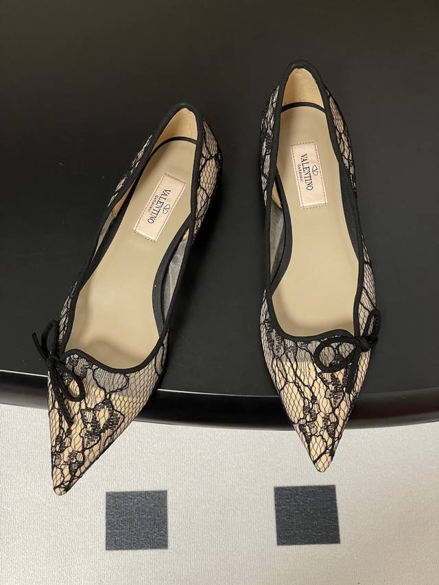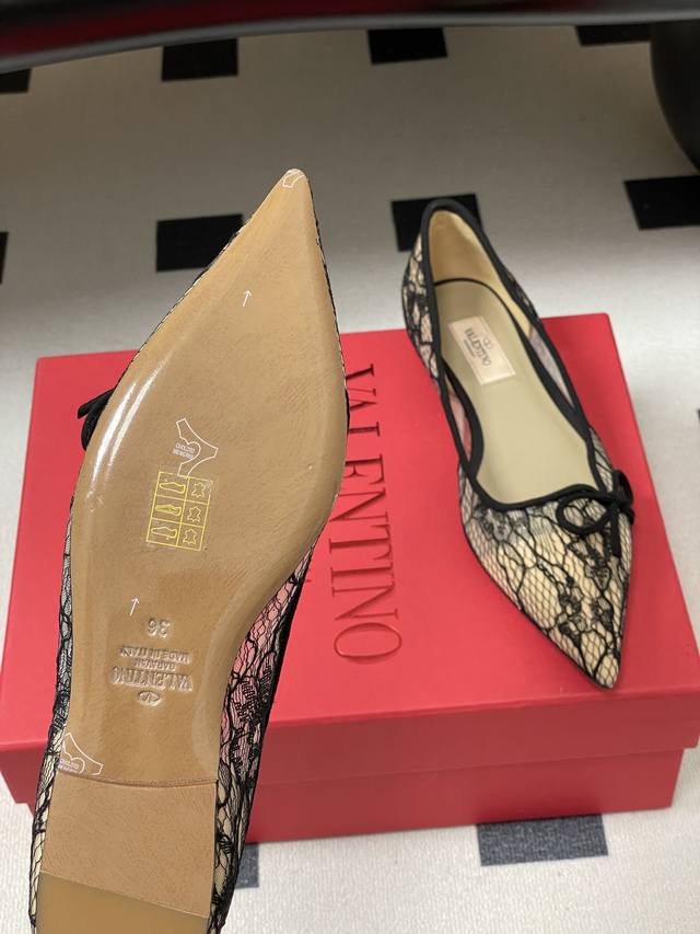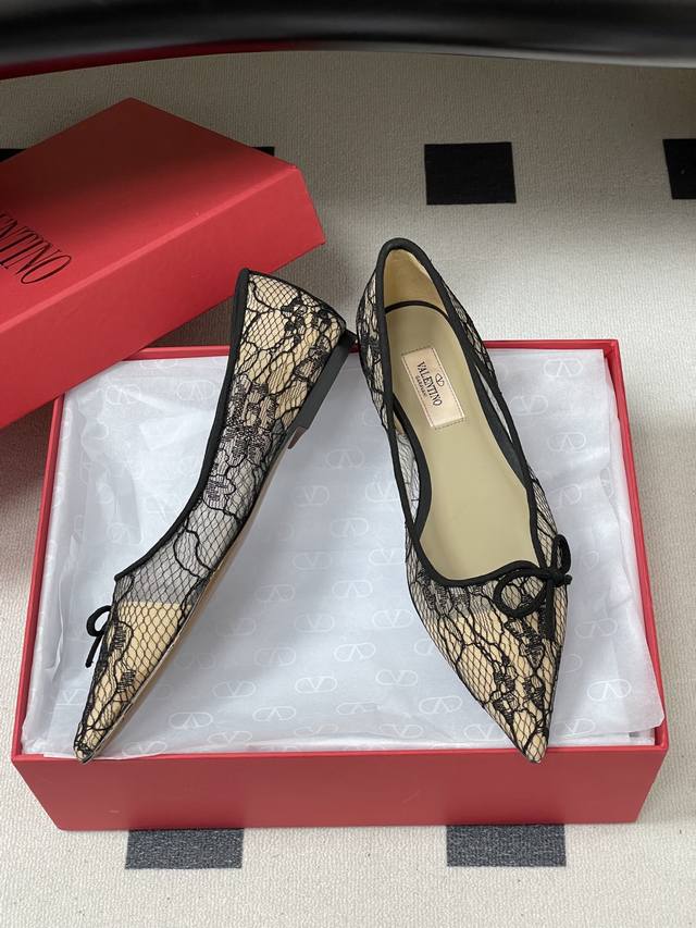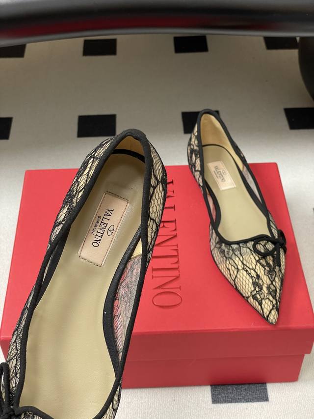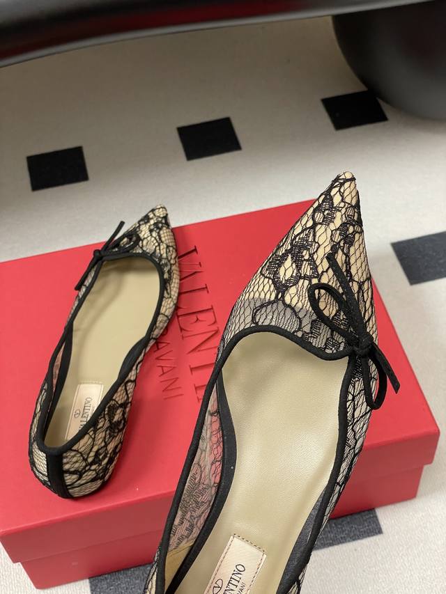 顶级品质 DDD Valentino 华伦天奴 尖头蕾丝网纱面平底单鞋蝴蝶结芭蕾舞鞋 DDD 采用了蕾丝材质,呈现出细腻的花纹图案,既轻盈又富有质感,同时蕾丝元素也为鞋子增添了一份浪漫与柔美气息。 DDD 鞋头处点缀着小巧的黑色蝴蝶结,为整体造型增添了俏皮与甜美的感觉,同时也提升了鞋子的精致度和时尚感。 DDD 是经典的尖头设计,能够拉长脚部线条,让双脚看起来更加修长优雅,同时也能很好地适配各种服饰风格,无论是搭配裙装还是裤装都很合适。 DDD 为平底设计,穿着起来舒适自在,即使长时间行走也不容易感到疲惫