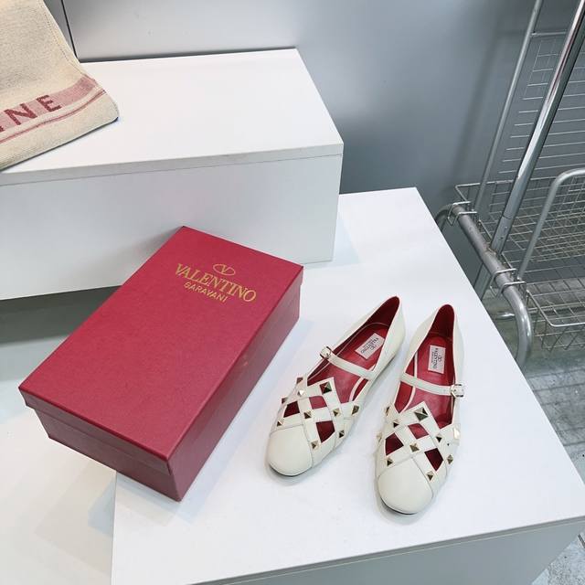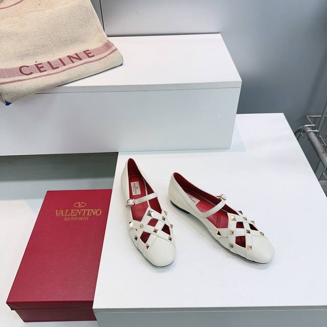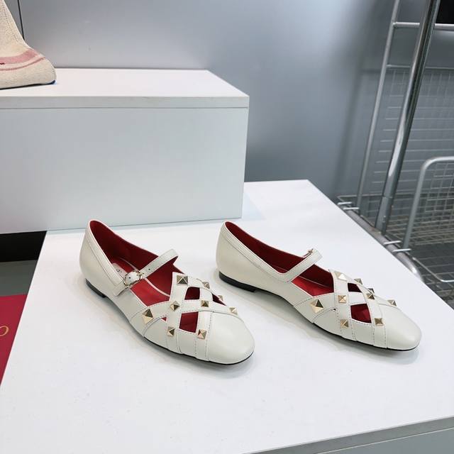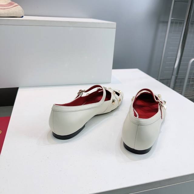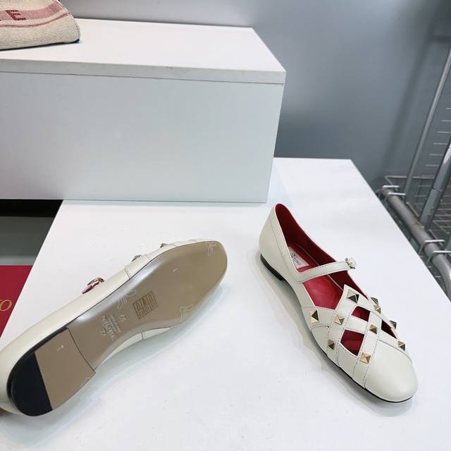 FFF 高品质出厂 !顶级品质 Valentino华伦天奴26春夏 官网新品铆钉平底玛丽珍单鞋!标志性经典铆钉元素,重工打造!以其优雅外形和精湛的工艺,成为了早春鞋履中的佼佼者。这款单鞋不仅外观出众,更是匠心之作,让人一见倾心。鞋头圆润精致,鞋身两仰线条弧度利落流畅,上脚藏肉显瘦包容性极好!!! DDD 铆钉颗颗闪亮,耀眼迷人,它们不仅为靴子增添了一抹独特的金属质感,更提升了其整体格调与品位。每一颗铆钉都是手工钉上去的,非常牢固,采用实心塑胶防腐,不生锈,不掉漆!从而创造一个充满表现力的设计风格! DDD