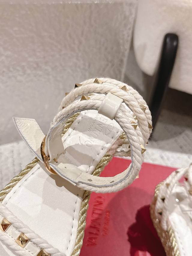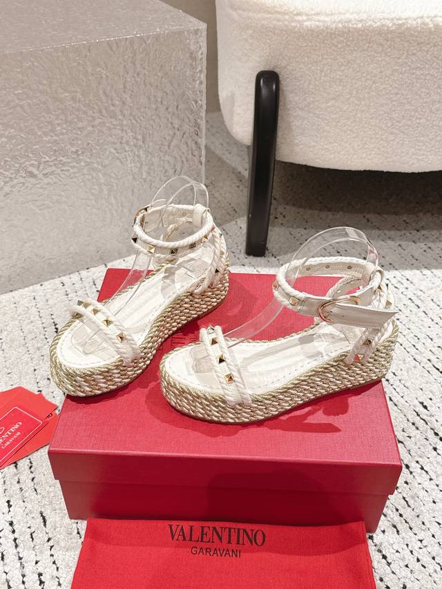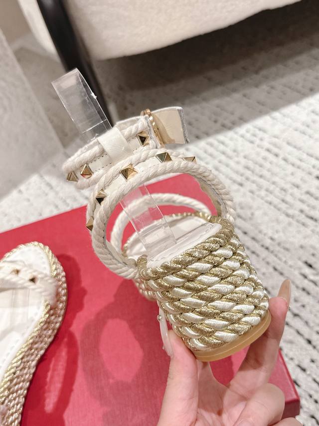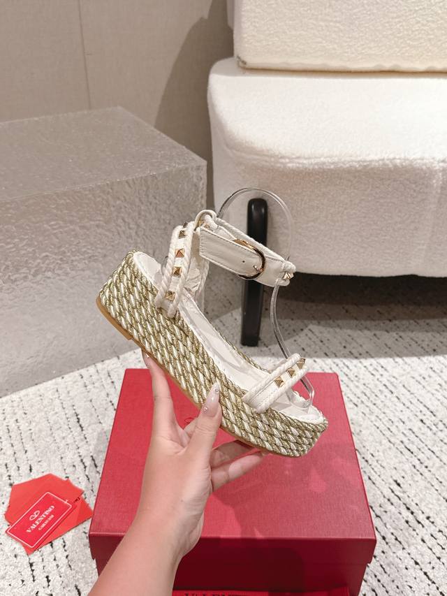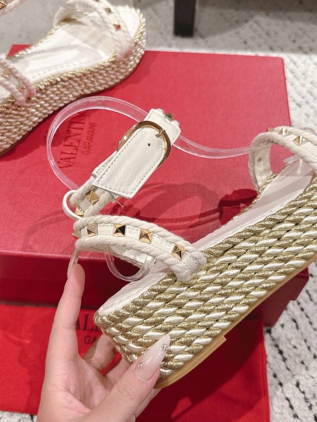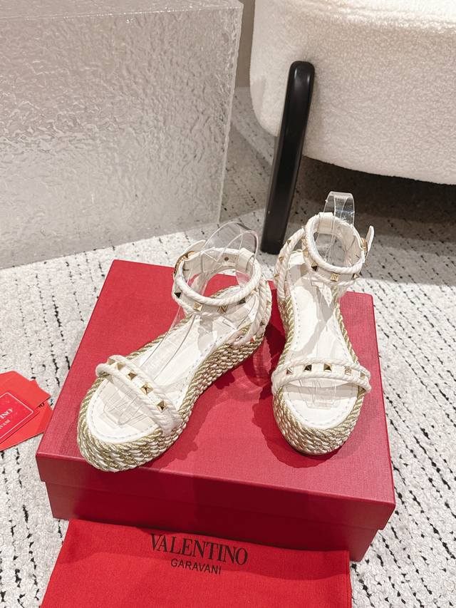 Valentino华伦天奴高版本新款铆钉麻绳编织坡跟凉鞋. 简约超级百搭. 上脚完美奢华可任意搭配春夏服饰. 脚感更是舒适!