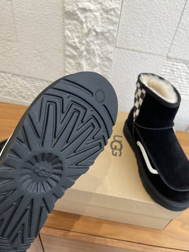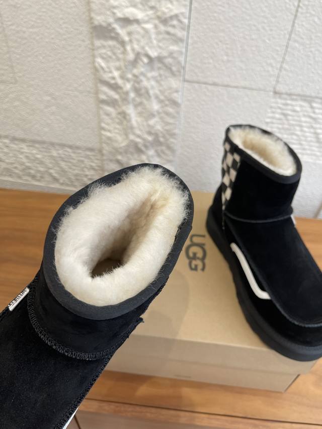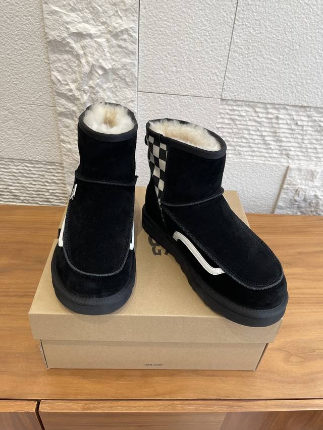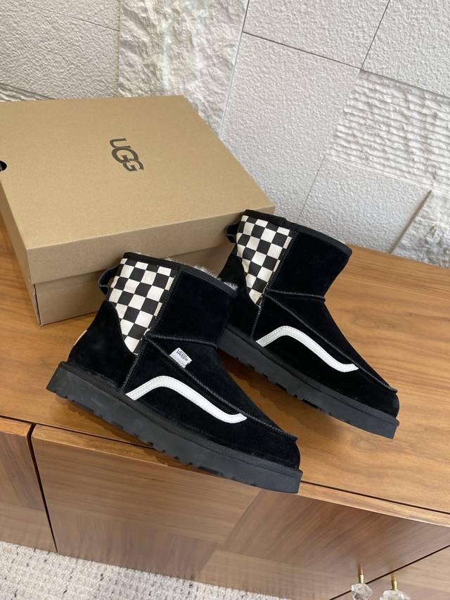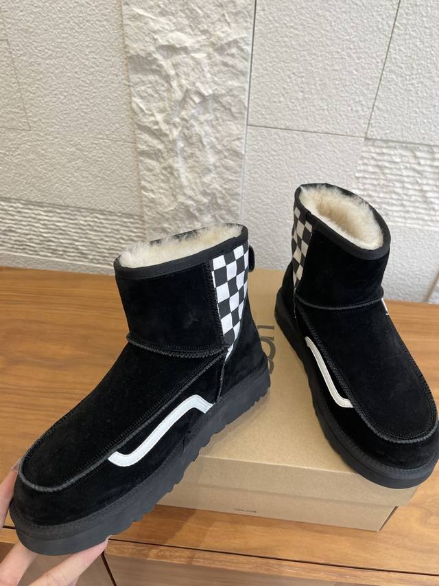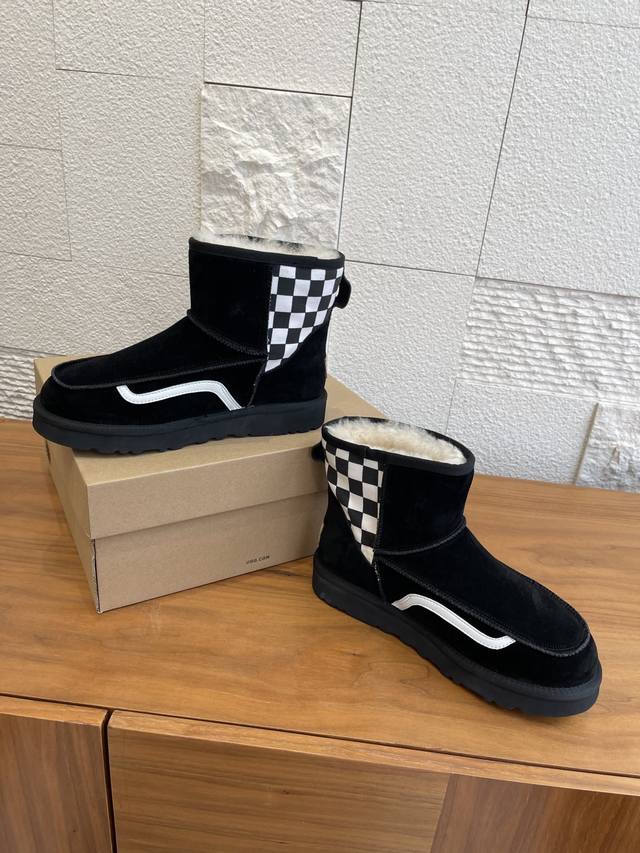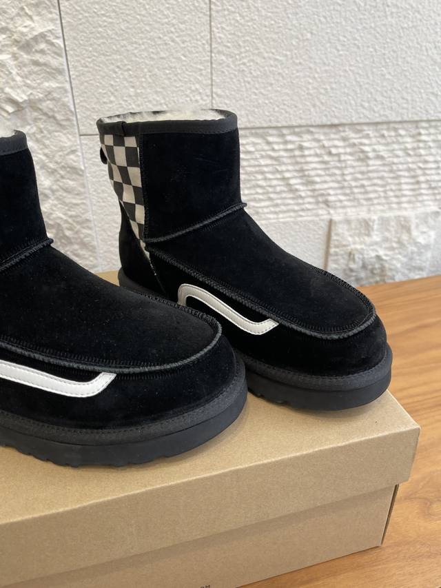 顶级版本: DDD Ugg X Vans 2025 秋冬新款 联名款雪地靴 DDD Ugg 和Vans万斯联名雪地靴,黑色麂皮鞋面+白色Vans侧边条纹,辨识度超高!棋盘格皮带扣点缀,酷飒又有型。内里是Ugg经典羊毛,保暖力满分,厚底设计穿着舒适还能悄悄增高。滑雪板鞋轮廓融合雪地靴温暖,冬季街头穿搭必备! DDD 面料:进口牛反绒 DDD 内里:进口羊毛 DDD 大底:原版开模Eva大底 DDD Size:35-40 40定做不退换 DDD