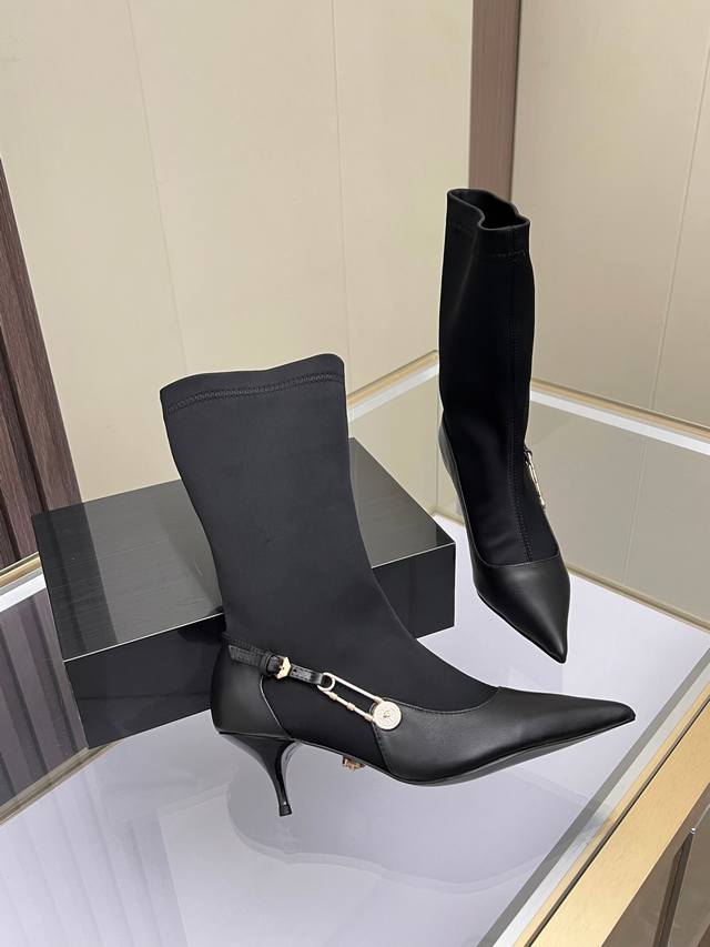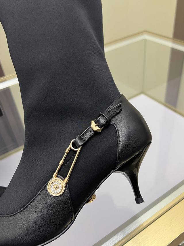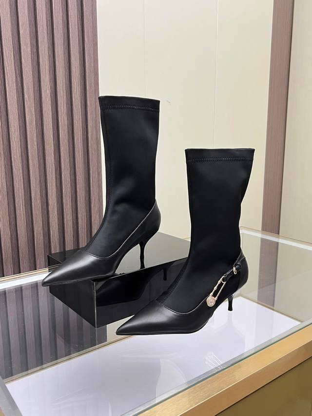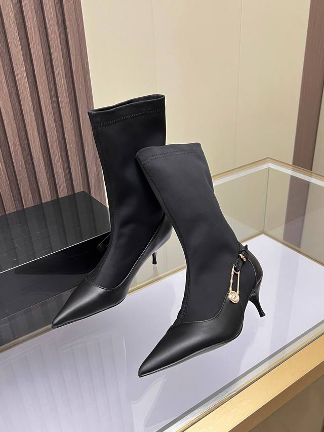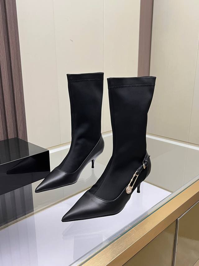 码数:35-41码,可定做42码 DDD 范思哲新款矮跟女靴,面料牛皮十弹力布,羊皮内里。羊皮垫脚,橡胶底 DDD 靴筒高度:30.5厘米 DDD 跟高:6厘米 DDD