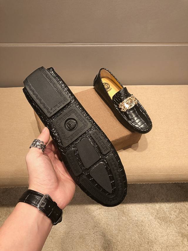FFF 品牌范思哲, 牛皮里 ,鞋面采用头层鳄鱼皮+美杜莎性感头像,男士的最爱,舒适透气牛里真材实料,原版进口耐磨橡胶底, 范思哲官网出品 精致优雅男士心备佳品,采用精湛的处理工艺。穿着舒适。精致简单鞋面尽显品牌低调优雅,适合四季衣橱,无论是专心致志地工作,与家人共度闲暇时光,还是在城市或乡间体验高雅的生活方式,该系列均可彰显真正的男性魅力。 [奋斗]标准码37~47 DDD