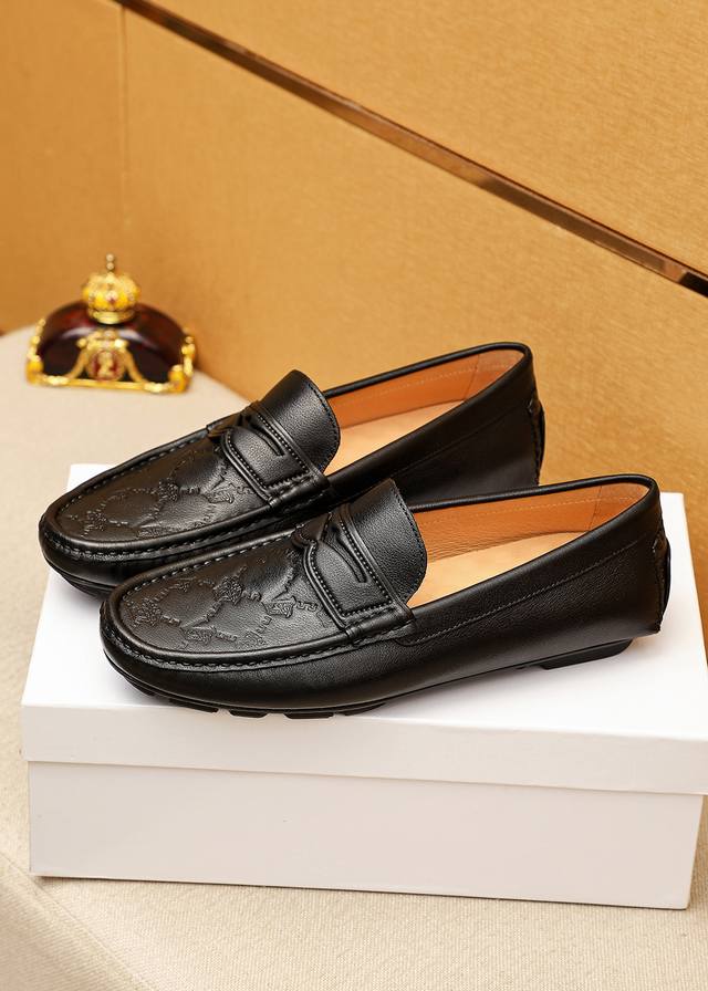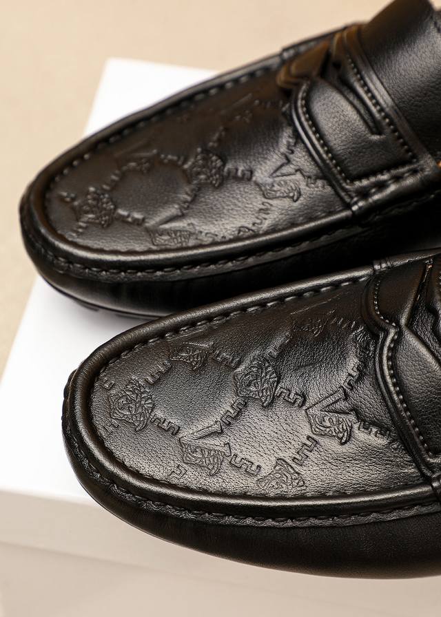 商品商标:Versace 范思哲 豆豆鞋 正码码数: 38-44 37.45.46订制 商品材料:精选 进口头层小牛皮压花鞋面,进口猪皮内里。强烈立体视觉效果,