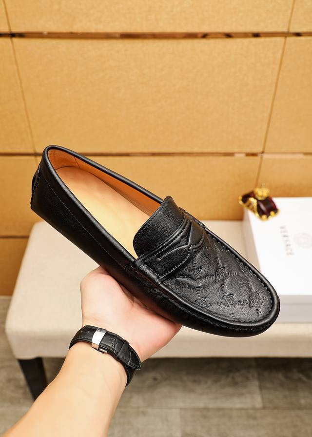 / 商品商标:Versace 范思哲 豆豆鞋 正码码数: 38-44 37.45.46订制 商品材料:精选 进口头层小牛皮压花鞋面,进口猪皮内里。强烈立体视觉效果,