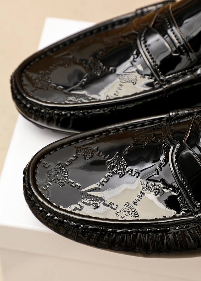商品商标:Versace 范思哲 豆豆鞋 正码码数: 38-44 37.45.46订制 商品材料:精选 进口头层开边珠牛皮压花鞋面,进口猪皮内里。强烈立体视觉效