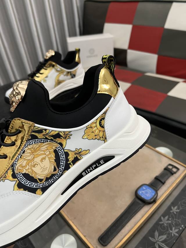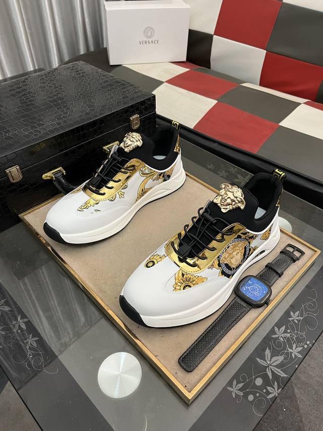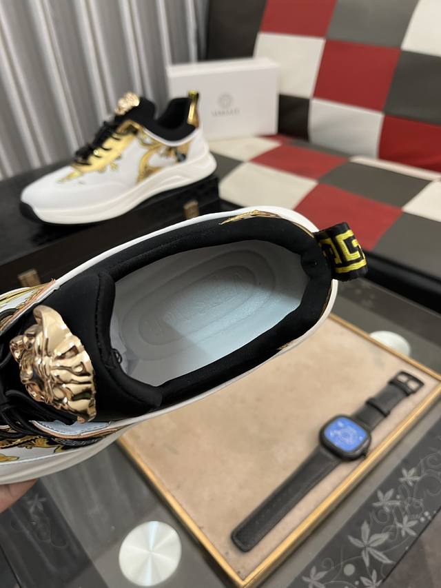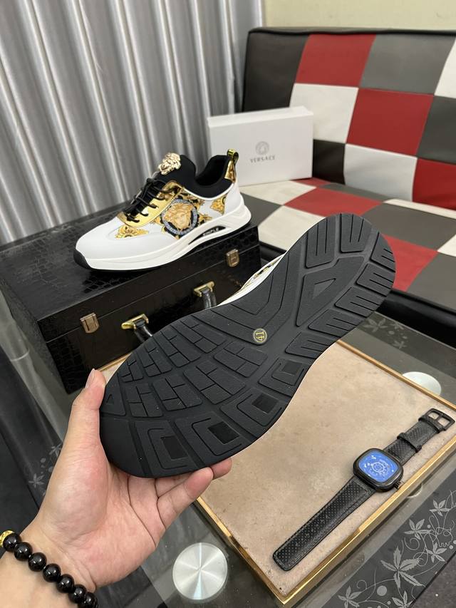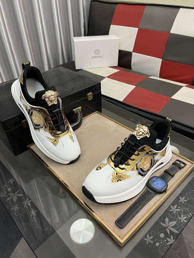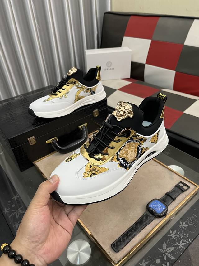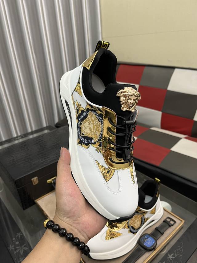 调工厂P价 男装男鞋 运动原单 Versace 范思哲时尚男鞋奢华品质,设计师在每一期都专业打造出范思哲每一款休闲鞋靴风格不一。鞋面采用意大利进口牛皮拼接,舒适网里上脚舒适。给你高调奢华的舒适体验 码数:38-442色可选