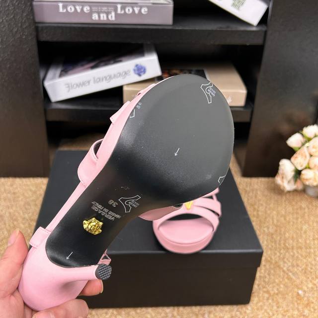 FFF Versace范思哲 6 Gianni Ribbon 美杜莎V扣八爪鱼凉鞋 正面饰V型链接扣镶钻配方头头型 DDD _______________________ DDD 海外热销冠军 DDD Yb一致原鞋开发楦型 各大时尚博主及明星、网红、已经人手一对,如此出众的美,让人过目不忘! DDD DDD Go 材质: DDD 鞋面:牛皮 DDD 内里垫脚:进口优质山羊皮 DDD 跟高:12.5Cm 水台:2.5Cm DDD 鞋底:意大利Italy牛皮大底 DDD 码数:- 42定制不退换 DDD 包装