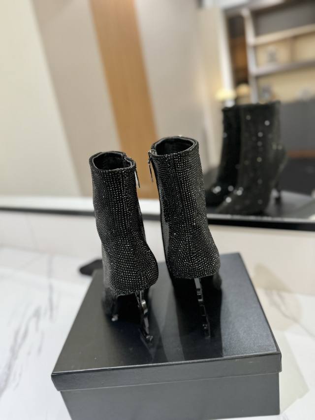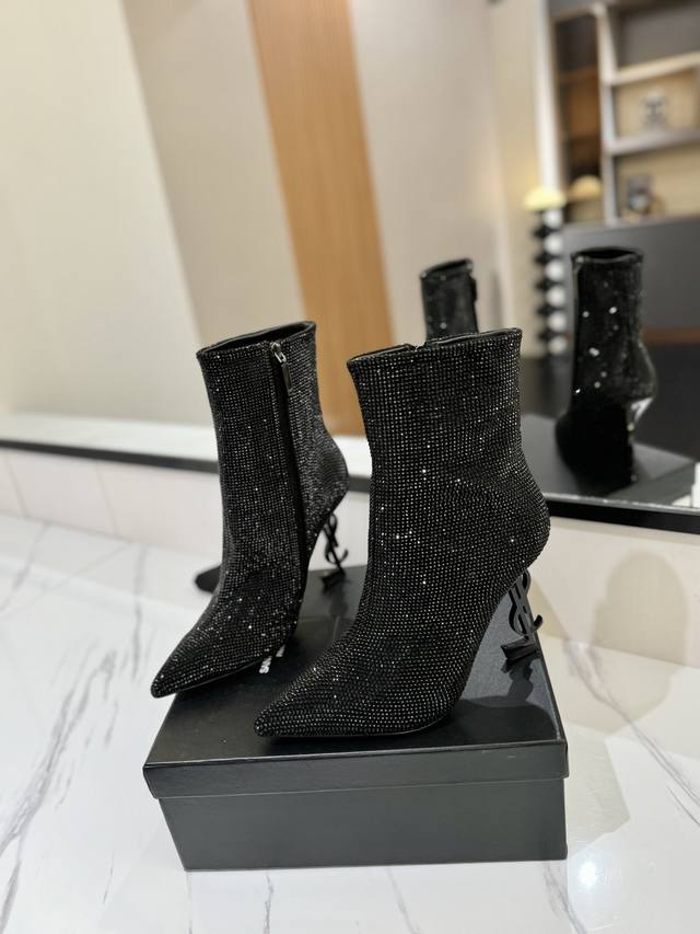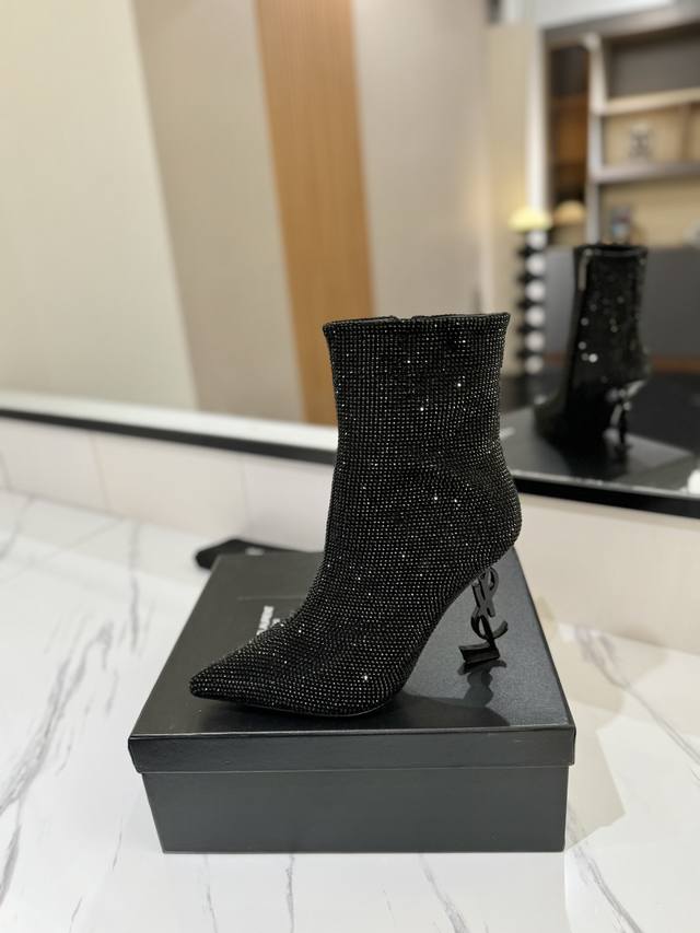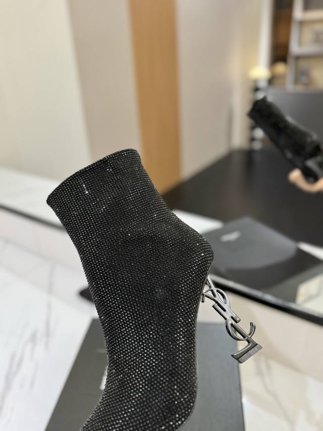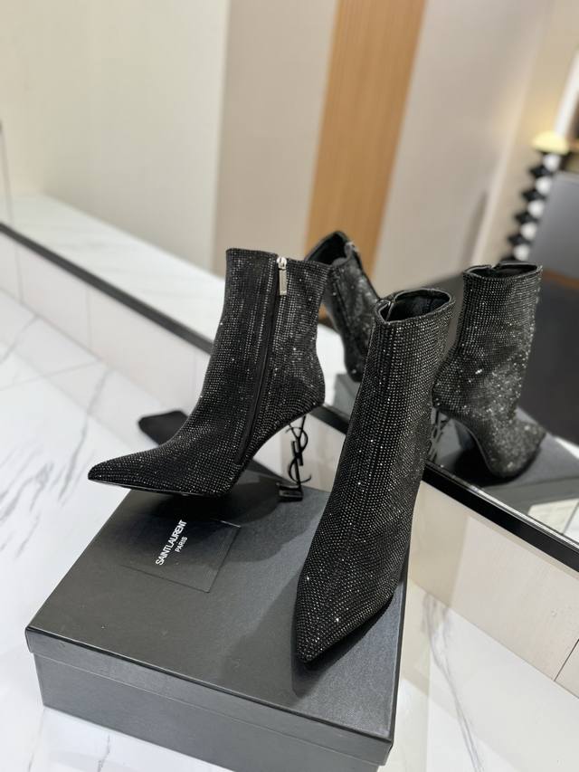 / 出厂价Pp: Saint Laurent 圣罗兰 DDD Ysl字母金属跟满钻拉链踝靴 短靴。满鞋水钻Bling Bling闪闪亮。 DDD 鞋面格利特牛皮镶嵌