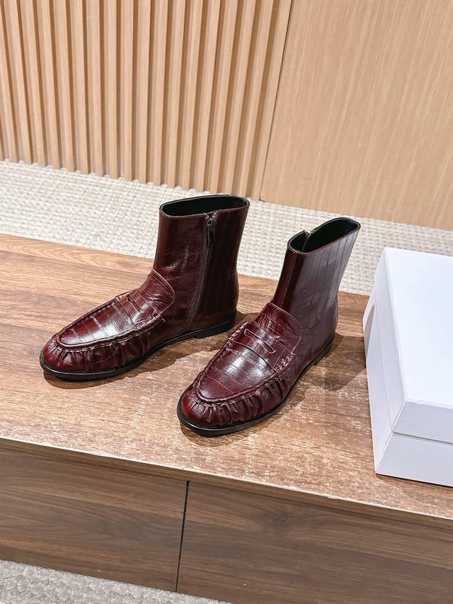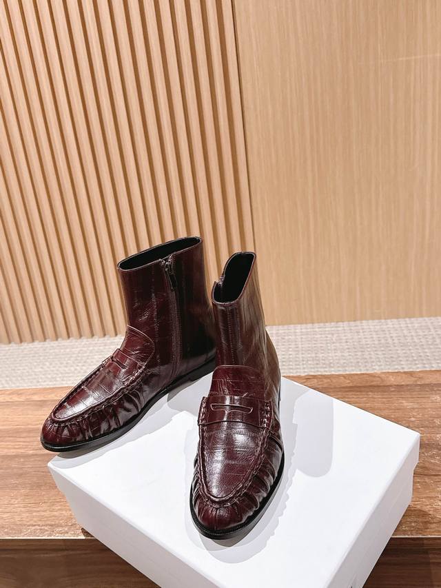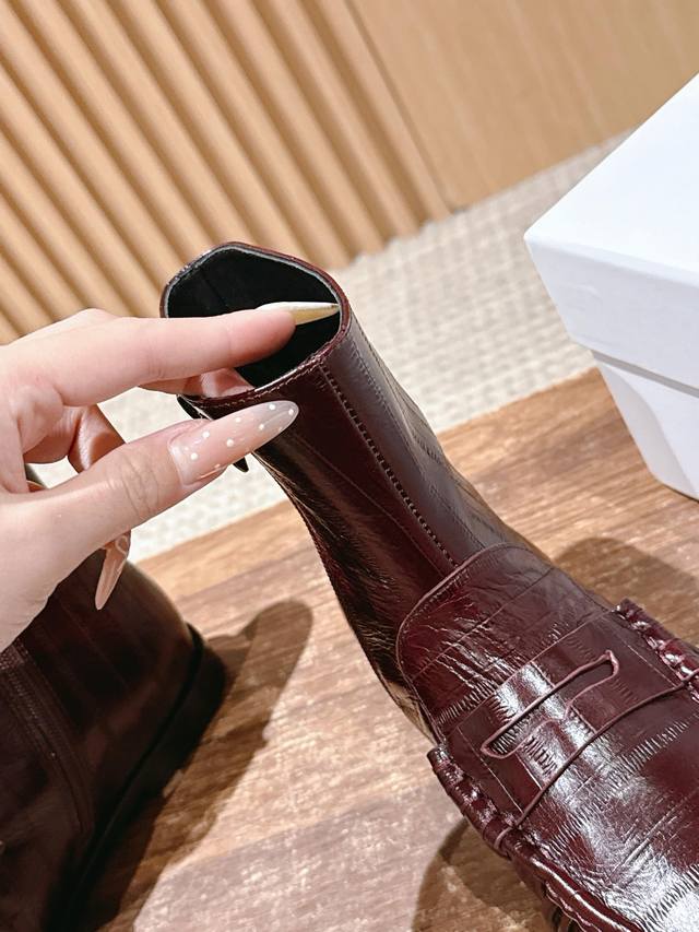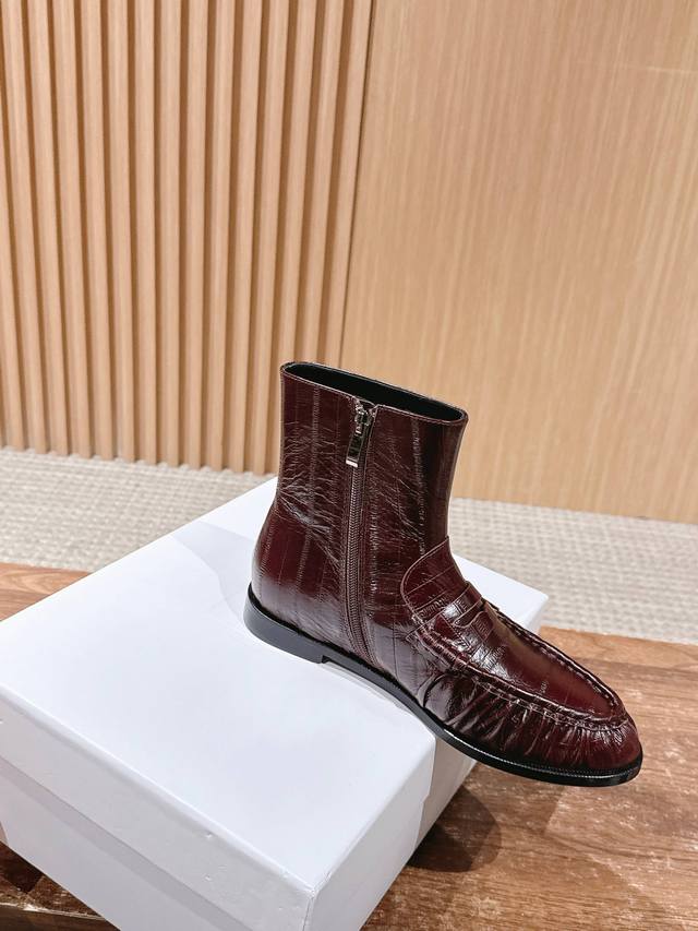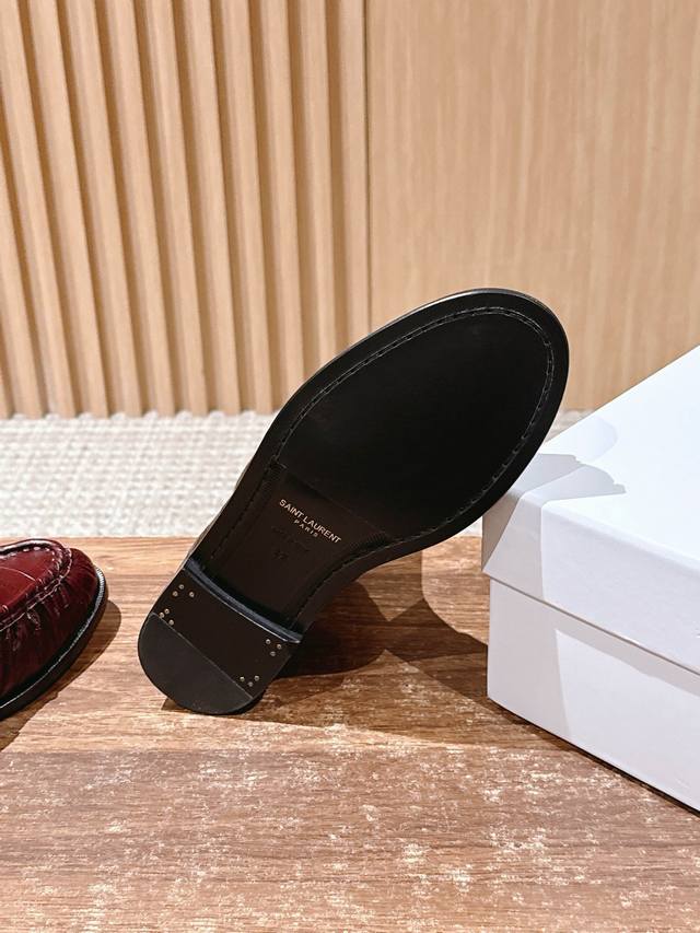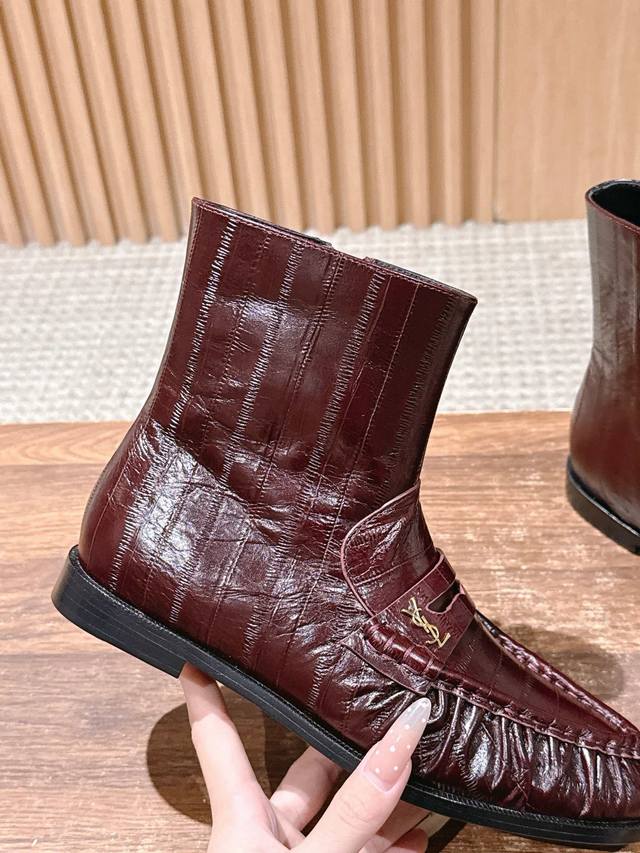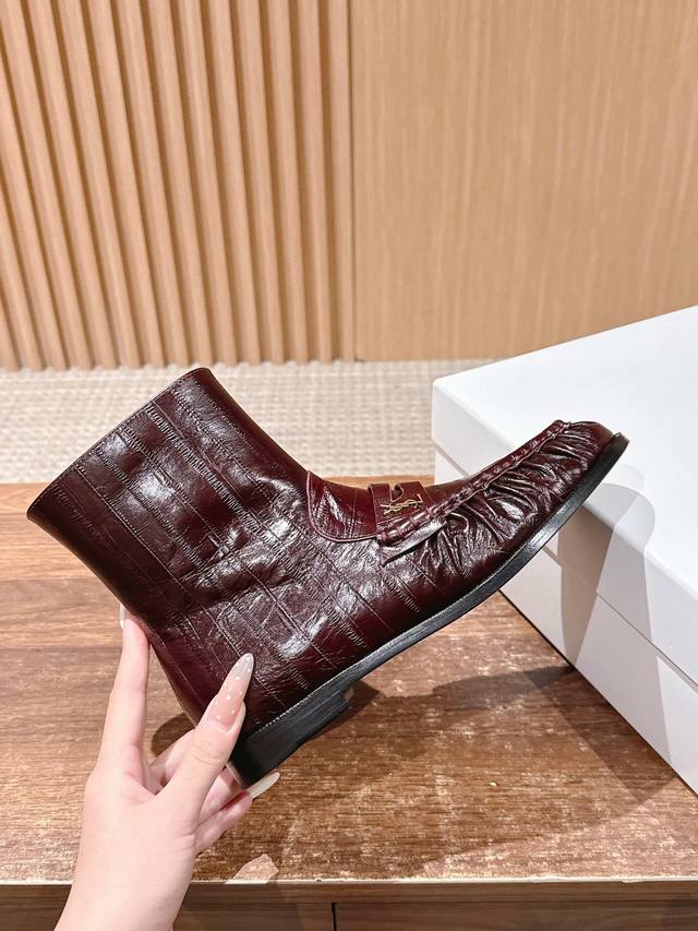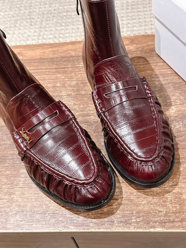 圣罗兰字母褶皱边乐福短靴 当乐福慵懒基因邂逅短靴的利落轮廓 DDD 它为秋冬造型注入毫不费力的时髦感。 DDD 鞋面的自然褶皱是点睛之笔, DDD 随步履流转的肌理如同随性勾勒的线条 DDD 既呼应了秋冬流行的松弛美学 DDD 又以细腻质感消解了靴履的厚重感 DDD 标志性金色Ysl字母徽标点缀鞋身 DDD 金属的冷冽光泽与褶皱的柔和肌理, DDD 将品牌半个多世纪的优雅底蕴凝于方寸之间 DDD 无论是搭配西装裤演绎职场干练 DDD 还是配针织裙诠释慵懒格调 都能适配。 DDD 让褶皱藏住随性 让徽标彰显