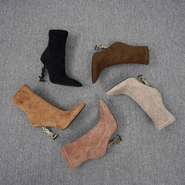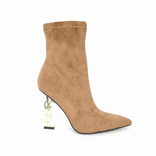 圣罗兰 Ysl 女士弹力短靴。 DDD p:意大利真皮大底: 米。 DDD 码数:35-42 DDD 材质与版型:采用浅棕色弹力麂皮材质,紧密贴合腿部线条,具有出色的瘦腿效果,过膝靴型能够拉长腿部比例,塑造优雅大气的造型。 DDD 品牌标识:鞋跟处设计有金色Ysl品牌标志性金属徽标,既是鞋跟的支撑结构,又作为品牌身份的经典体现,极具辨识度与奢华感。 DDD 鞋型细节:采用尖头设计,进一步延伸视觉上的腿部长度;鞋跟为细高跟款式,结合品牌徽标的独特设计,既保证了时尚感,又在一定程度上兼顾了设计的巧思与穿着的风