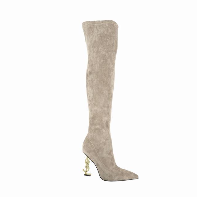 圣罗兰 Ysl 女士弹力过膝高靴。 DDD p:意大利真皮大底: 。 DDD 码数:35-42 DDD 材质与版型:采用浅棕色弹力麂皮材质,紧密贴合腿部线条,具有出色的瘦腿效果,过膝靴型能够拉长腿部比例,塑造优雅大气的造型。 DDD 品牌标识:鞋跟处设计有金色Ysl品牌标志性金属徽标,既是鞋跟的支撑结构,又作为品牌身份的经典体现,极具辨识度与奢华感。 DDD 鞋型细节:采用尖头设计,进一步延伸视觉上的腿部长度;鞋跟为细高跟款式,结合品牌徽标的独特设计,既保证了时尚感,又在一定程度上兼顾了设计的巧思与穿着的