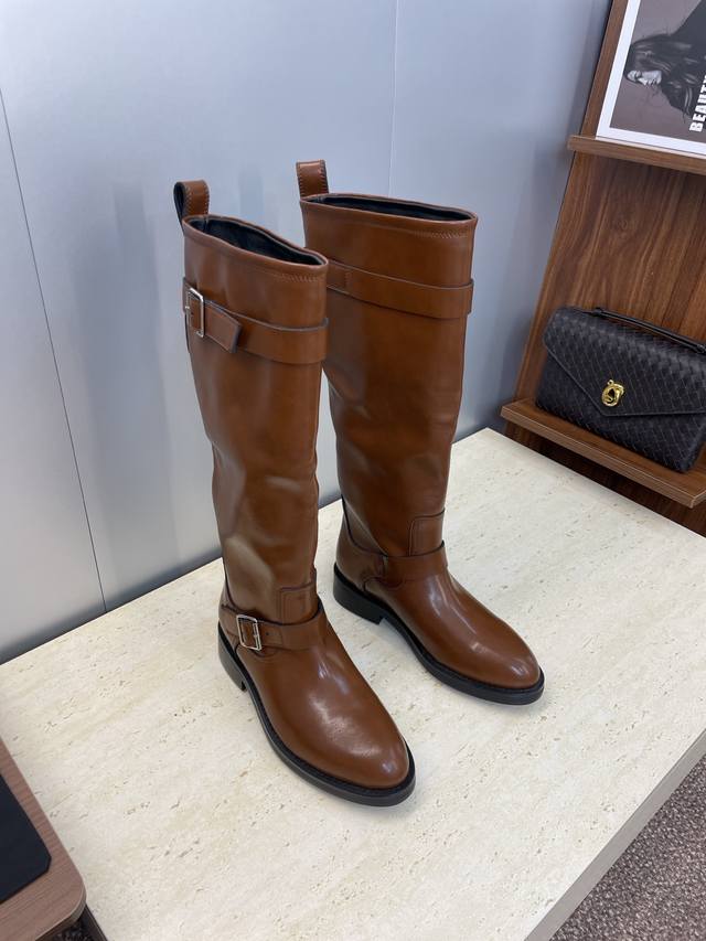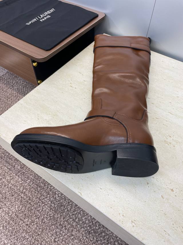 / 工厂P价P Saint Laurent 圣罗兰 2025秋冬新款及膝女靴 Ysl字母Logo五金皮带扣厚底低跟圆头机车骑士高筒长靴 材质:鞋面进口小牛皮+进口混