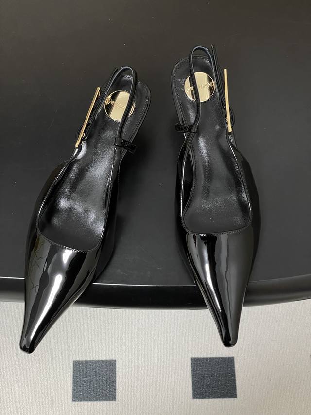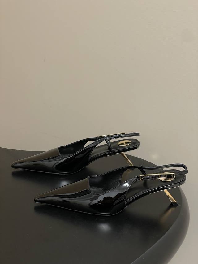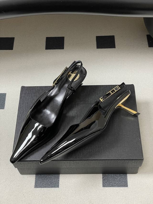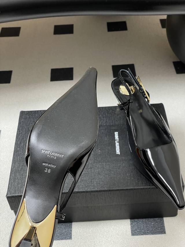 FFF DDD Saint Laurent Fw25 New Arrival~ DDD Ysl圣罗兰2026春夏新款尖头小猫跟后空凉鞋亮面高跟鞋异形金色跟凉鞋 DDD 整个鞋非常的简约大气~小尖头更加的精致时髦可以看到我们鞋子侧面是按照人体腿型设计出来的弧度~上脚非常秀气好看不挑人~拉长腿型~适合各种场合搭配~秋冬穿搭必备单品! DDD 鞋面:牛漆皮 DDD 内里垫脚:羊皮 DDD 鞋底:意大利真皮大底 DDD 跟高:5.5Cm DDD 码数:35-39 40.41定做不退换 DDD
