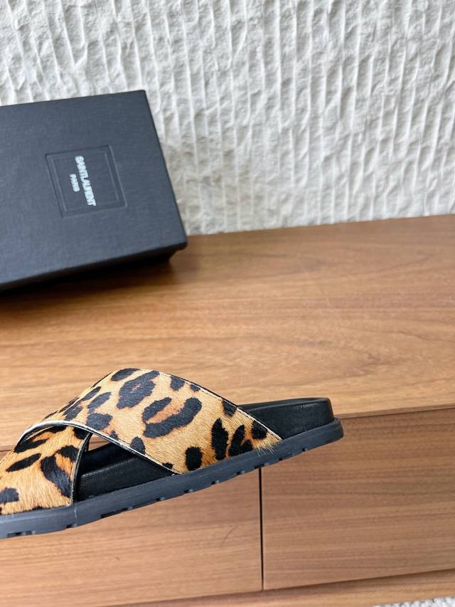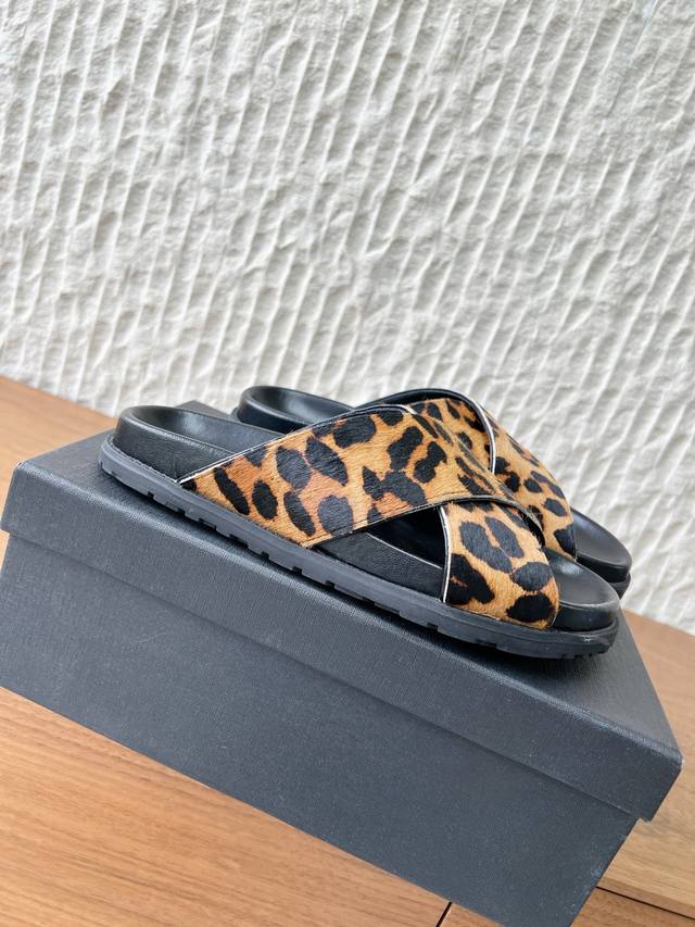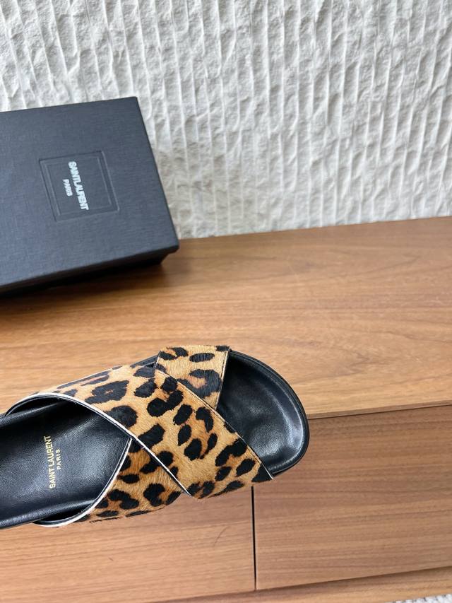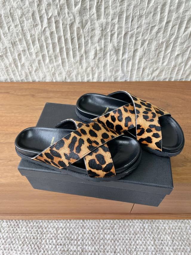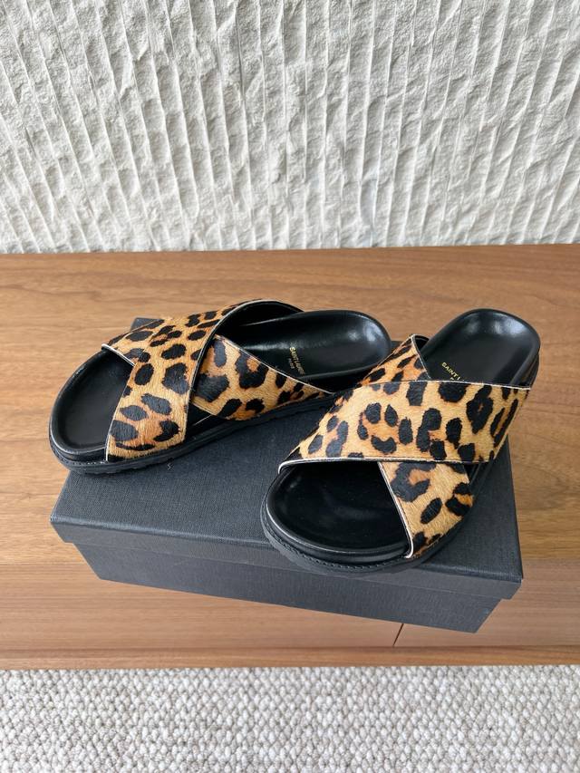 FFF G173 Saint Laurent 圣罗兰 26Ss早春新款 豹纹 交叉带 拖鞋 DDD 鞋面带为交叉设计,露趾的同时增加了造型的复古与个性感。 DDD 属于平底穆勒拖款式,无后跟设计,穿脱便捷; DDD 鞋内印有Ysl品牌标识,延续了品牌轻奢的工艺水准,兼具野性时尚感与品牌辨识度。 DDD 鞋面:采用原版进口马毛 DDD 内里垫脚:羊皮 DDD 大底:原版定制橡胶大底 DDD Size:35-39 40.41定制不退换 DDD