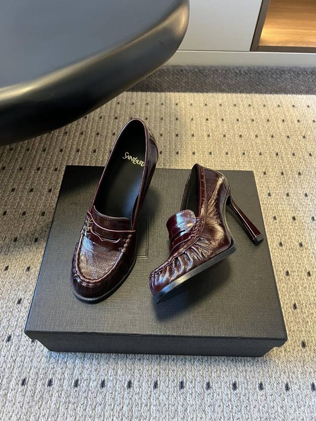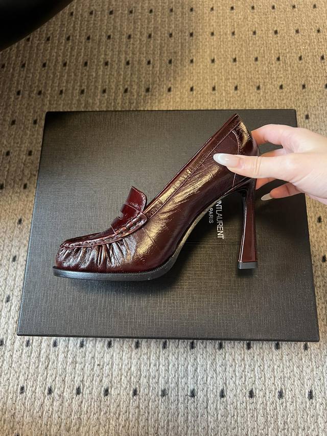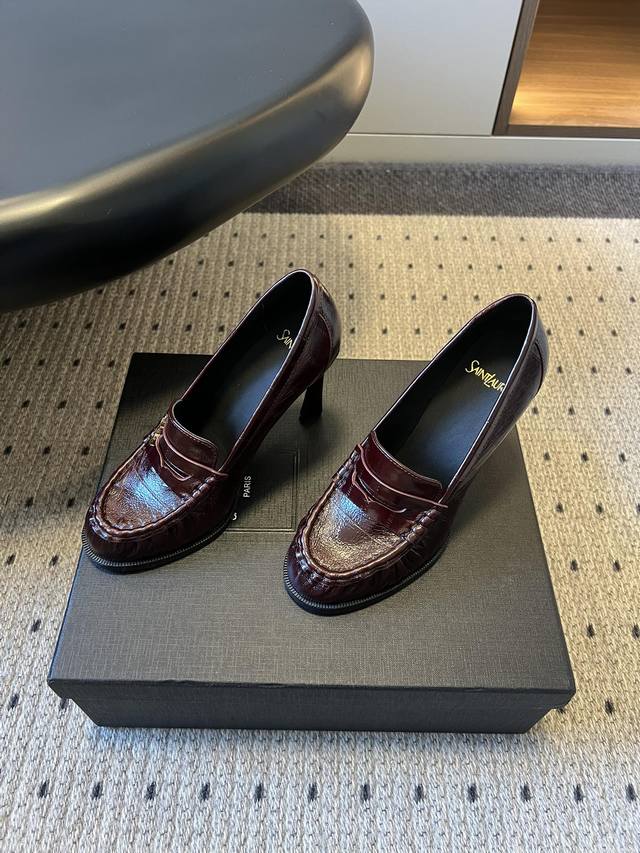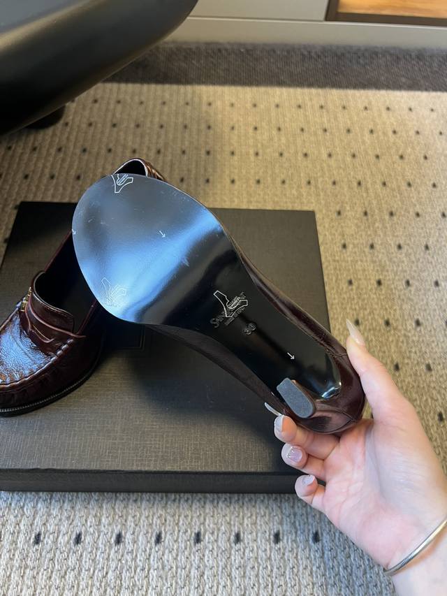 Saint Lauren*复古法式风细高跟套脚乐福鞋 DDD 款式高跟为无鞋带的套脚乐福鞋型,设计经典且风格偏轻奢、通勤。鞋身带有Ysl标志性的金属Logo标识,低调嵌入设计中,强化品牌辨识度的同时不破坏整体简约感。 DDD 涵盖漆皮、亮面金属质感皮革、绒面麂皮、哑光皮革等,不同材质带来不同的视觉与触感体验。有银色金属色、米白色、黑色、酒红色、棕色等,色系从冷调金属色到暖调大地色、复古酒红色都有覆盖,适配不同穿搭场景。 DDD 鞋面:牛皮 牛反绒 Ddd 内里:羊皮 Ddd 大底:真皮大底 Ddd 增高: