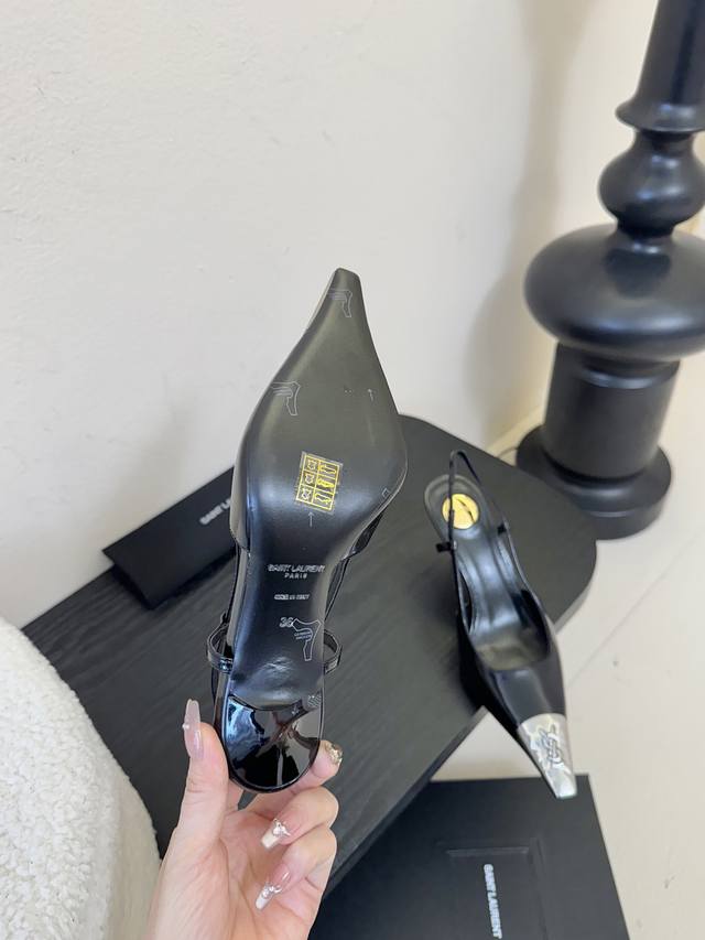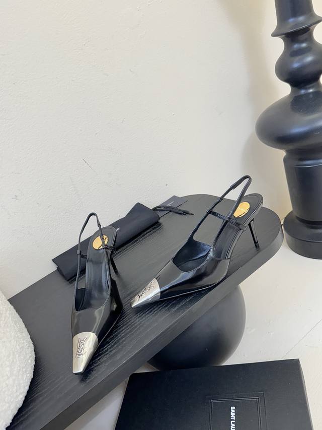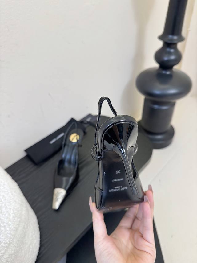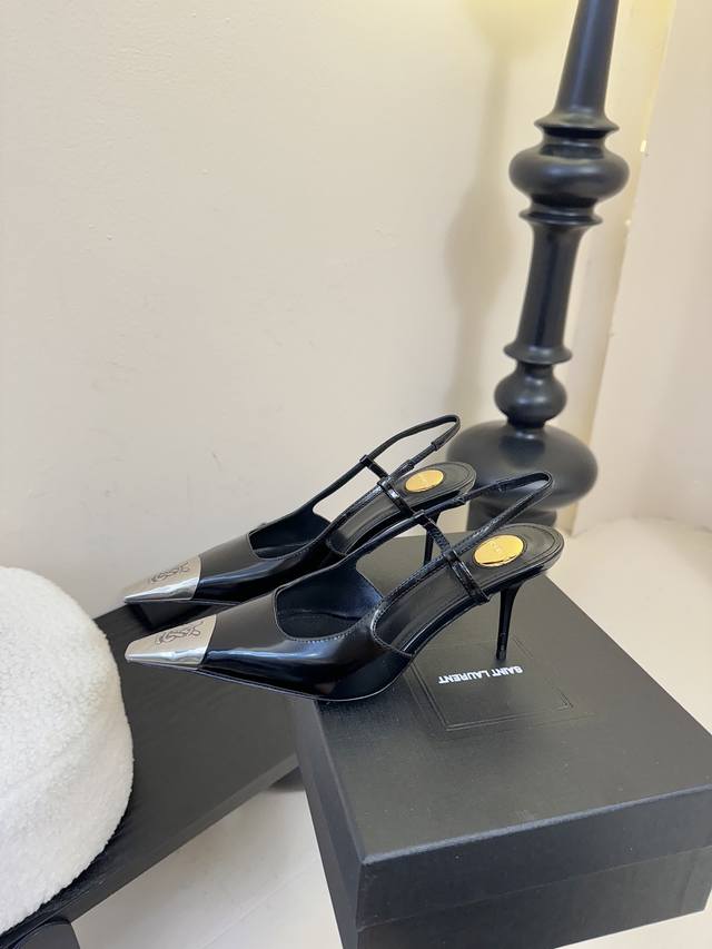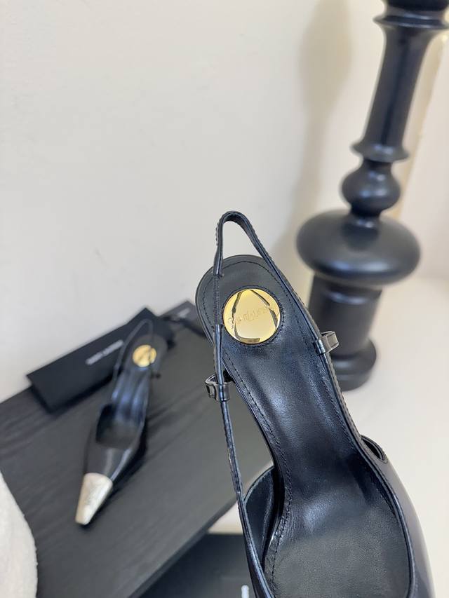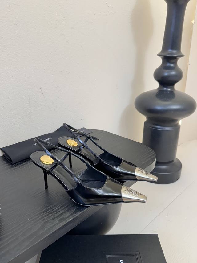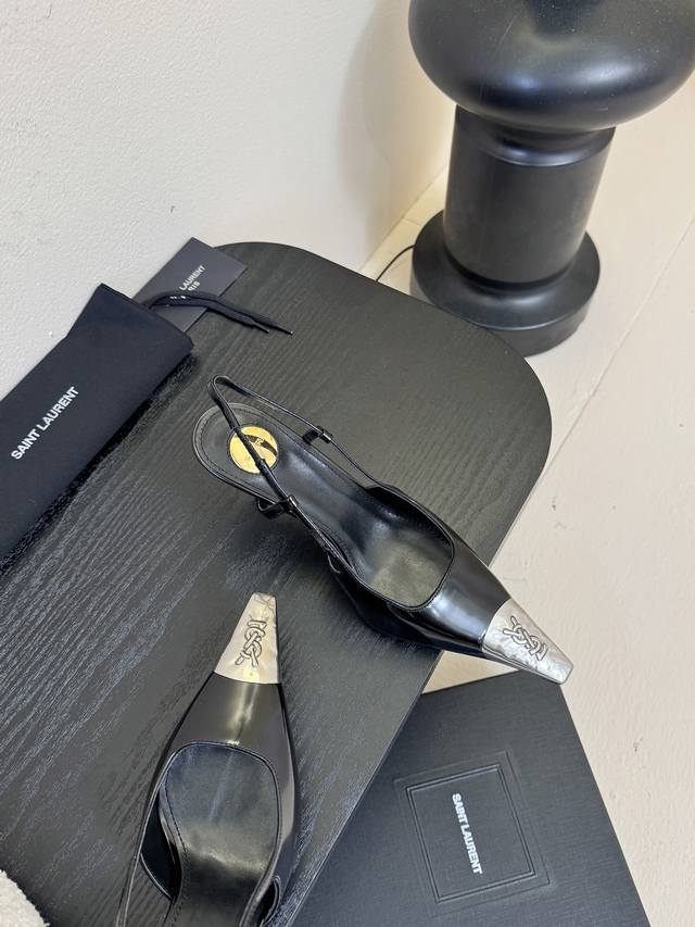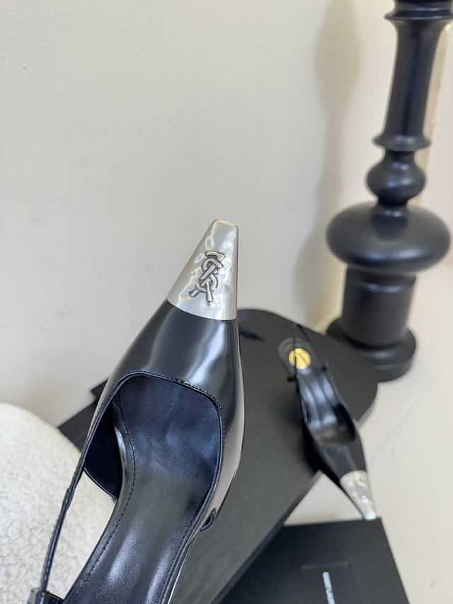 Saint Lauren* 圣罗兰金属尖头高跟鞋 融合复古与摩登感,金属尖头带有品牌标志性Logo,极具辨识度,后空绑带设计增添性感与轻盈感。尖头+细跟设计,修饰脚型的同时提升气场,后空绑带的结构让穿着更贴合脚型,兼具美观与实用性。 搭配黑色西装裤或高腰直筒裤,上衣选择简约白衬衫或真丝衬衫,干练又不失高级感,适合职场通勤。 鞋面:开标珠牛皮 真丝 内里:牛皮 鞋底:真皮大底 尺码:35-40 40定制不退不换