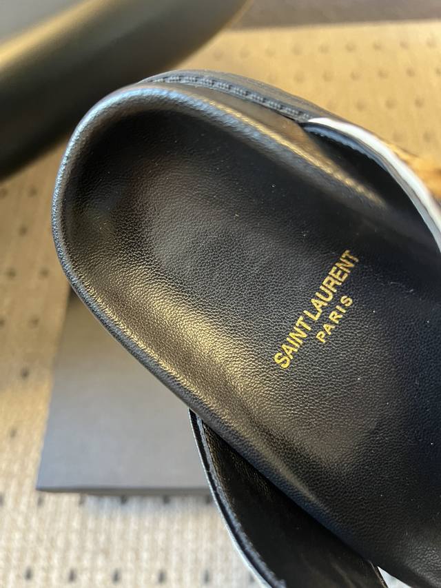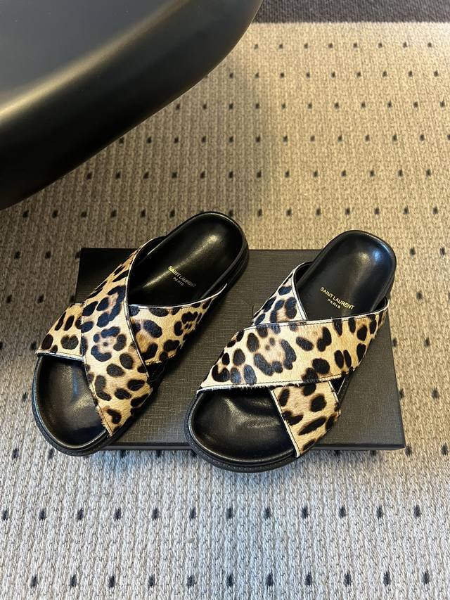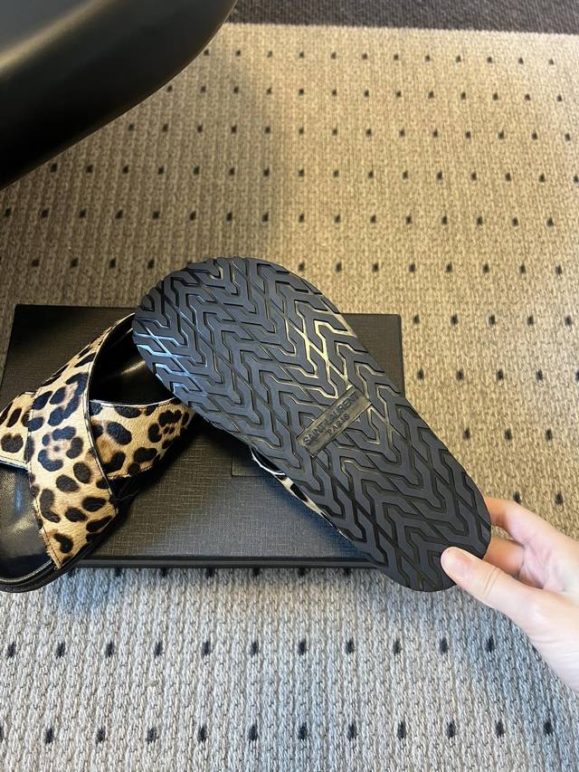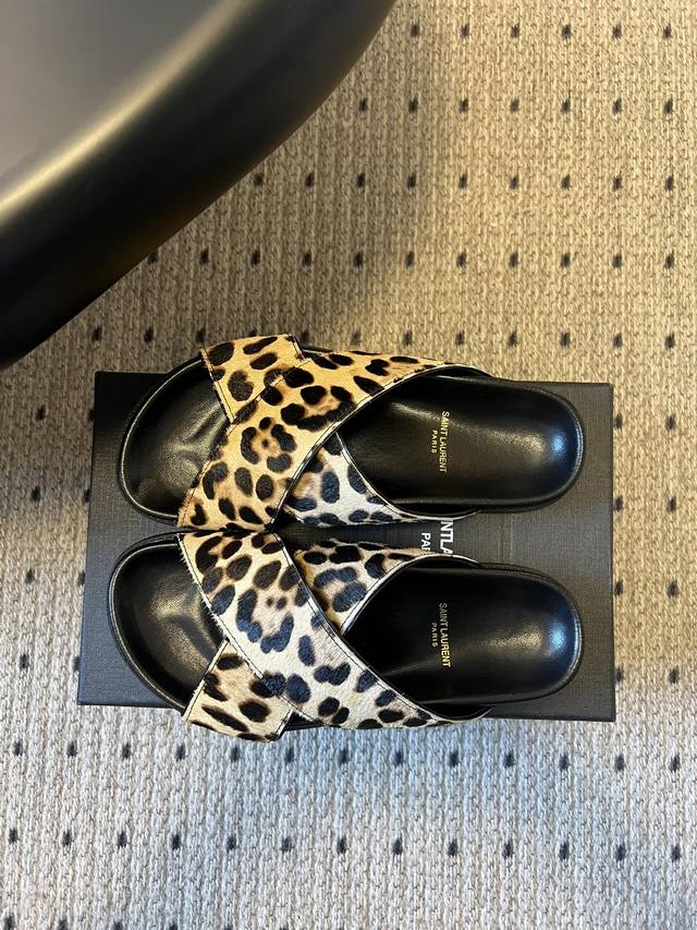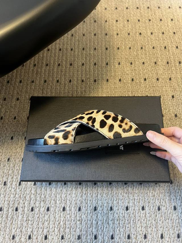 Saintlauren*25Ss春夏新款豹纹交叉带拖鞋 DDD 鞋面采用经典豹纹元素,有浅棕底浅纹、深棕底深纹两款豹纹配色,视觉上形成层次感;鞋面带为交叉设计,露趾的同时增加了造型的复古与个性感。属于平底穆勒拖款式,无后跟设计,穿脱便捷; DDD 鞋内印有Ysl品牌标识,鞋面采用仿马毛皮革材质,触感与视觉肌理感强,延续了品牌轻奢的工艺水准,兼具野性时尚感与品牌辨识度。 DDD 鞋面:马毛 Ddd 内里:羊皮 Ddd 大底:橡胶大底 Ddd **:2Cm Ddd Size:35-40码 40码定制不退换 D