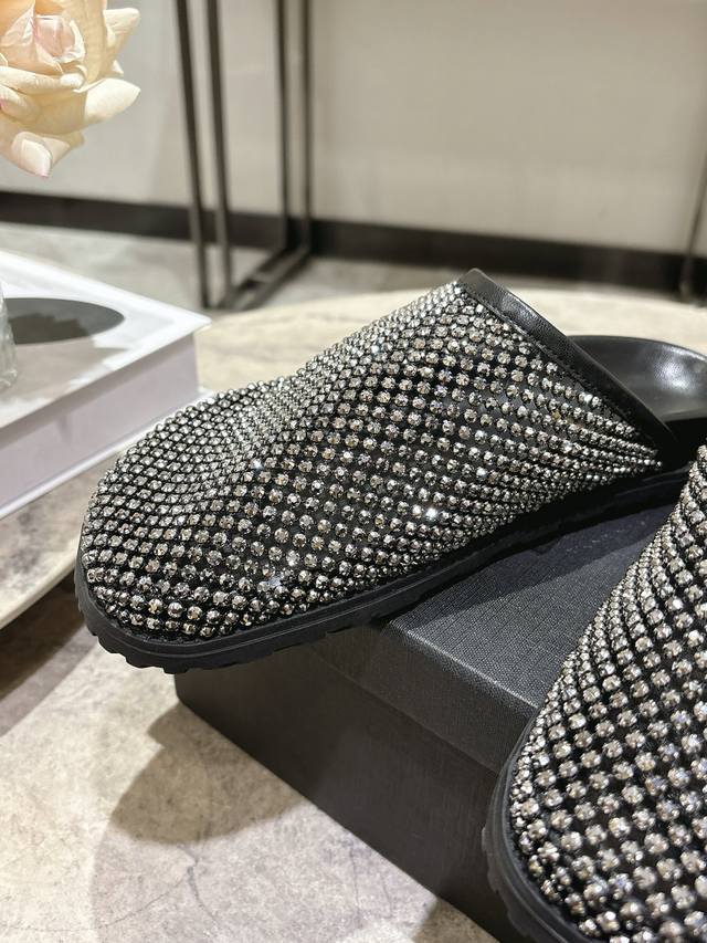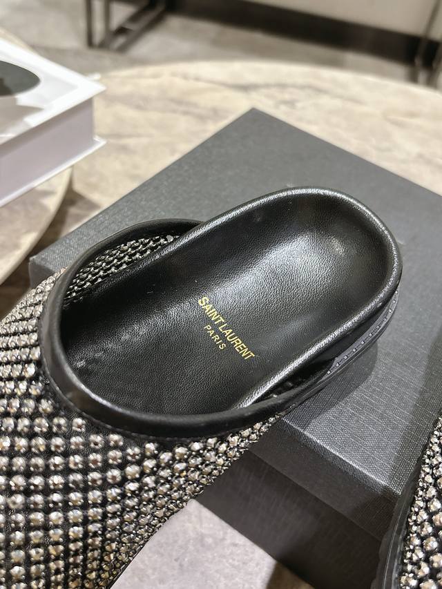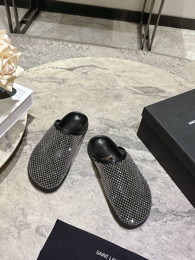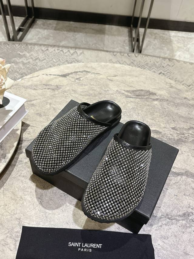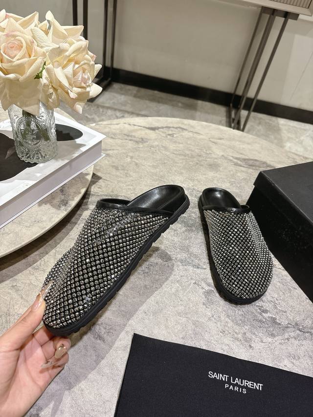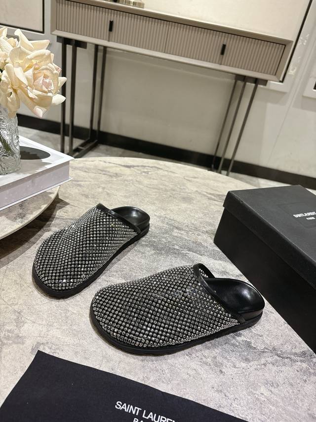 FFF Saintlaurent圣罗兰25Ss秋冬钻面穆勒半拖鞋休闲鞋 DDD 鞋面通体覆盖水钻装饰,采用网格状排列的钻面设计,光泽感强;推出金色、黑色两款配色,金色款鞋身与内里同色,黑色款钻面搭配黑色皮质内里,视觉对比鲜明。 DDD 为包头穆勒拖半拖款式,无后跟设计,一脚蹬穿脱便捷;鞋型为简约的平底包头款,线条流畅,兼顾实用性与造型感。鞋内可见Ysl品牌标识,采用皮革内里与质感鞋底,延续了圣罗兰轻奢精致的工艺水准,兼具时尚度与品牌辨识度。 DDD 鞋面:网钻 DDD 内里:羊皮 DDD 大底:橡胶大底
