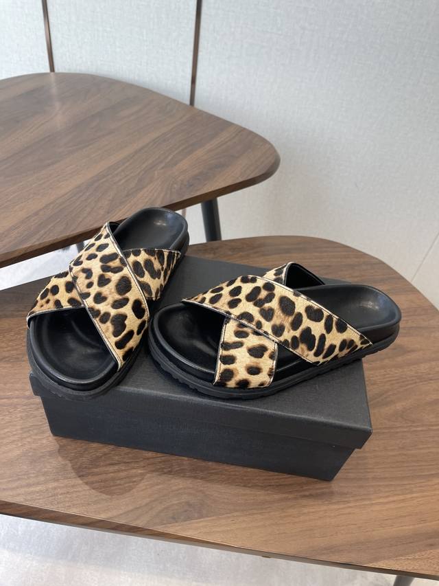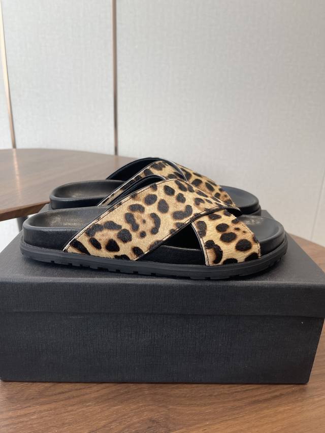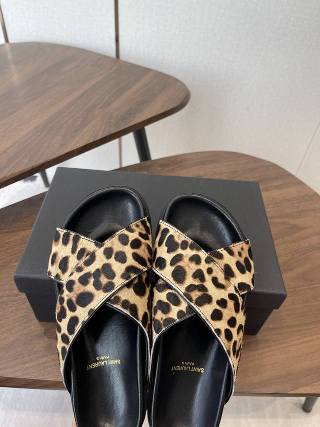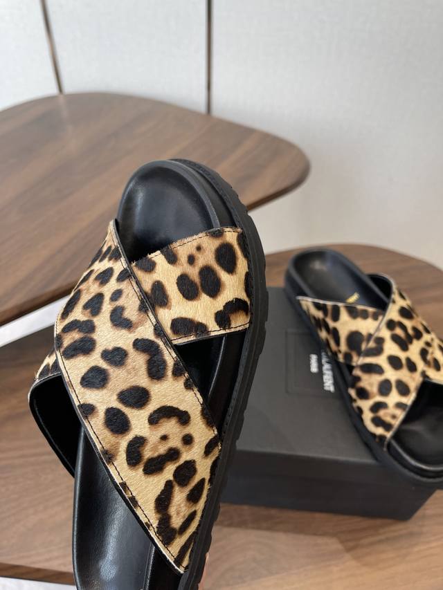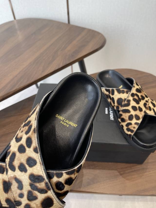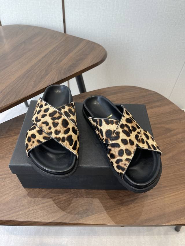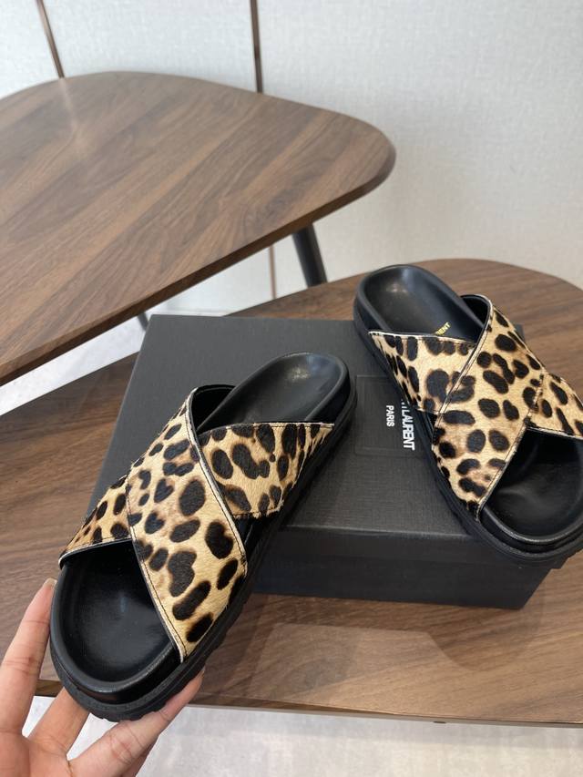 FFF Saintlaurent25Ss春夏新款豹纹交叉带拖鞋 DDD 鞋面采用经典豹纹元素,有浅棕底浅纹、深棕底深纹两款豹纹配色,视觉上形成层次感;鞋面带为交叉设计,露趾的同时增加了造型的复古与个性感。属于平底穆勒拖款式,无后跟设计,穿脱便捷; DDD 鞋内印有Ysl品牌标识,鞋面采用仿马毛皮革材质,触感与视觉肌理感强,延续了品牌轻奢的工艺水准,兼具野性时尚感与品牌辨识度。 DDD 鞋面:马毛 DDD 内里:羊皮 DDD 大底:橡胶大底 DDD 增高:2Cm DDD Size:35-40码 40码定制不