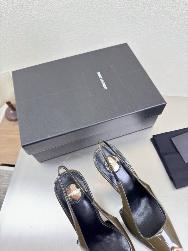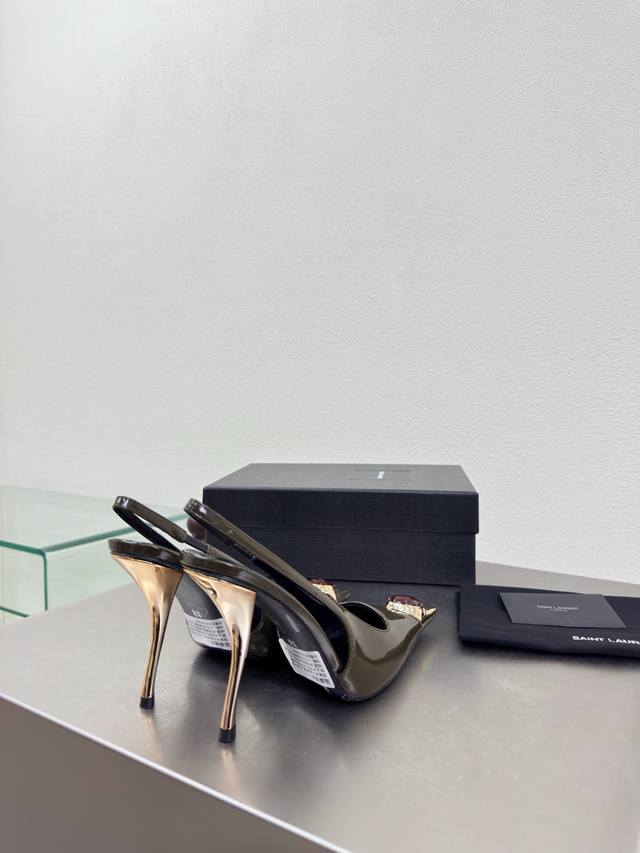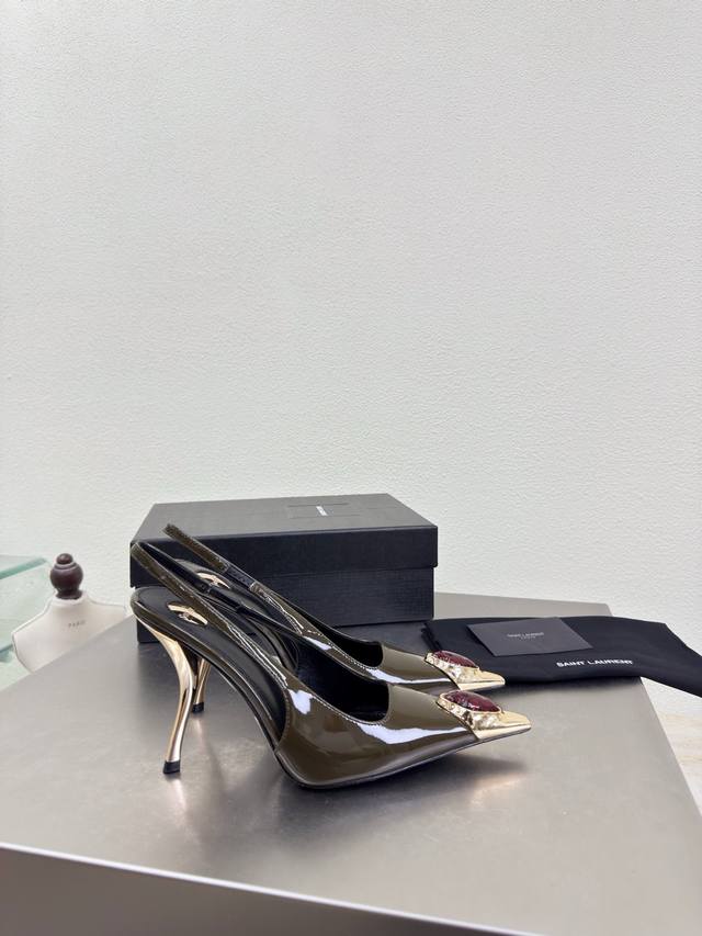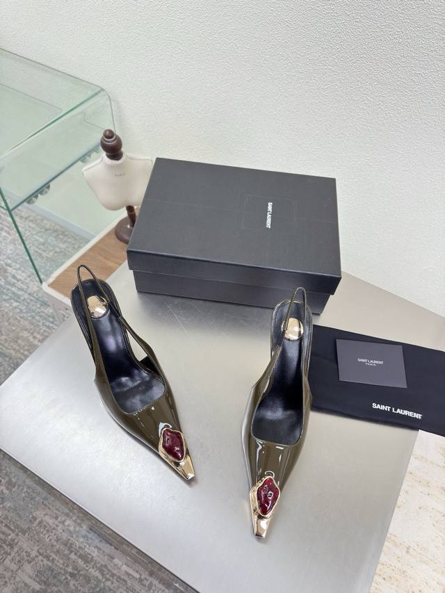/ Ysl 宝石系列 后空高跟鞋 10.5 Cm 跟高 Yvette Saint Laurent圣罗兰Logo 精致高跟 橄榄绿色 小牛漆皮 搭配 红色宝石 最懂女