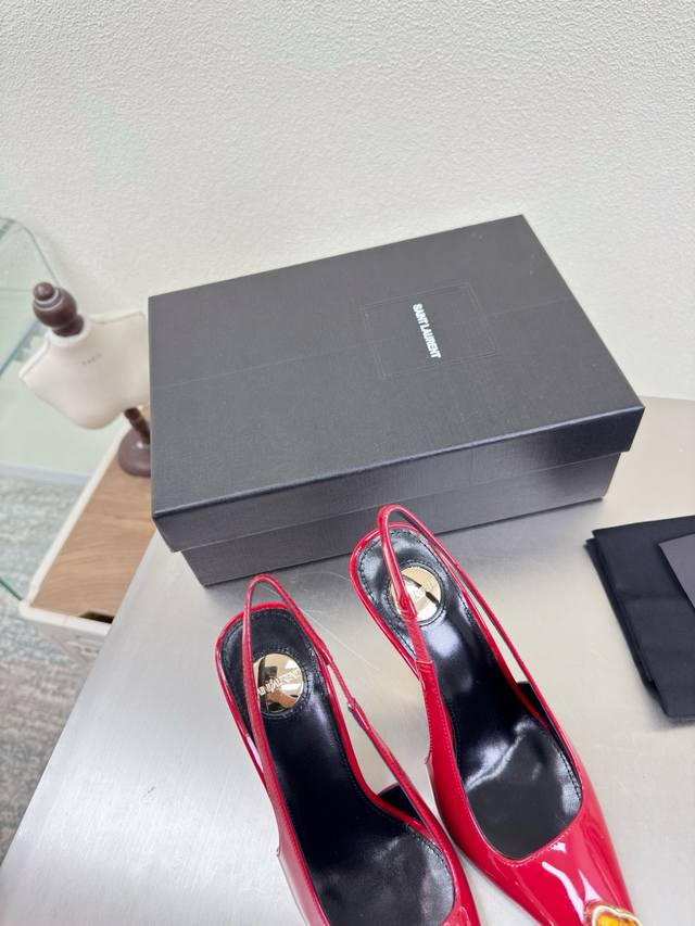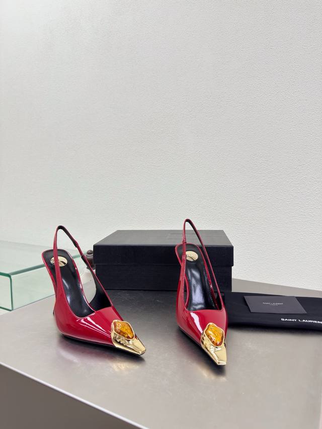 / Ysl 宝石系列 后空高跟鞋 10.5 Cm 跟高 Yvette Saint Laurent圣罗兰Logo 精致高跟 红色小牛漆皮 搭配 红色宝石 最懂女人心的