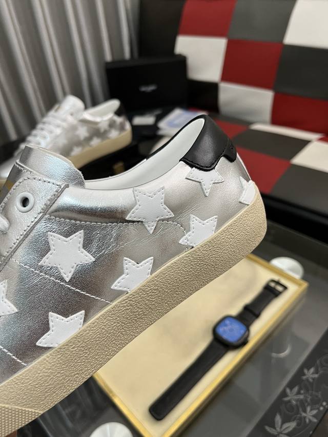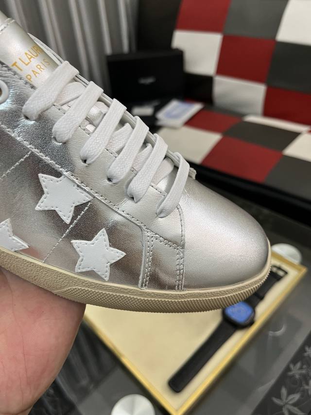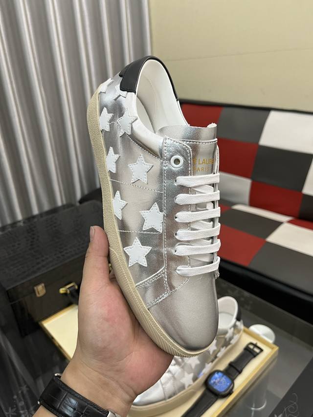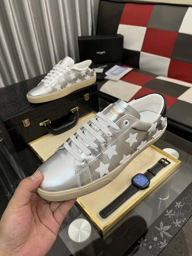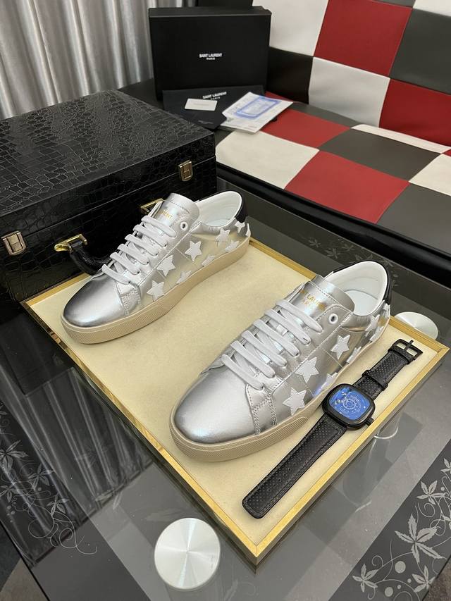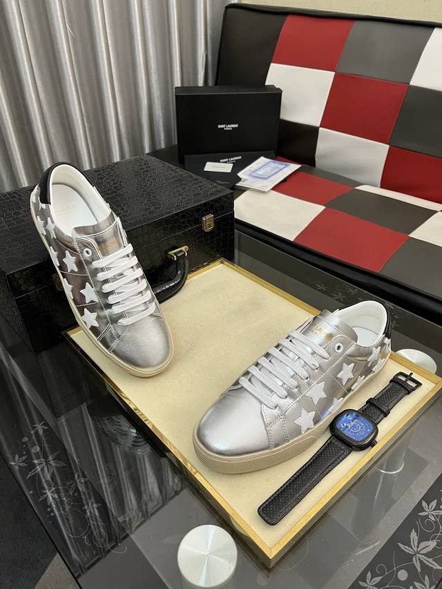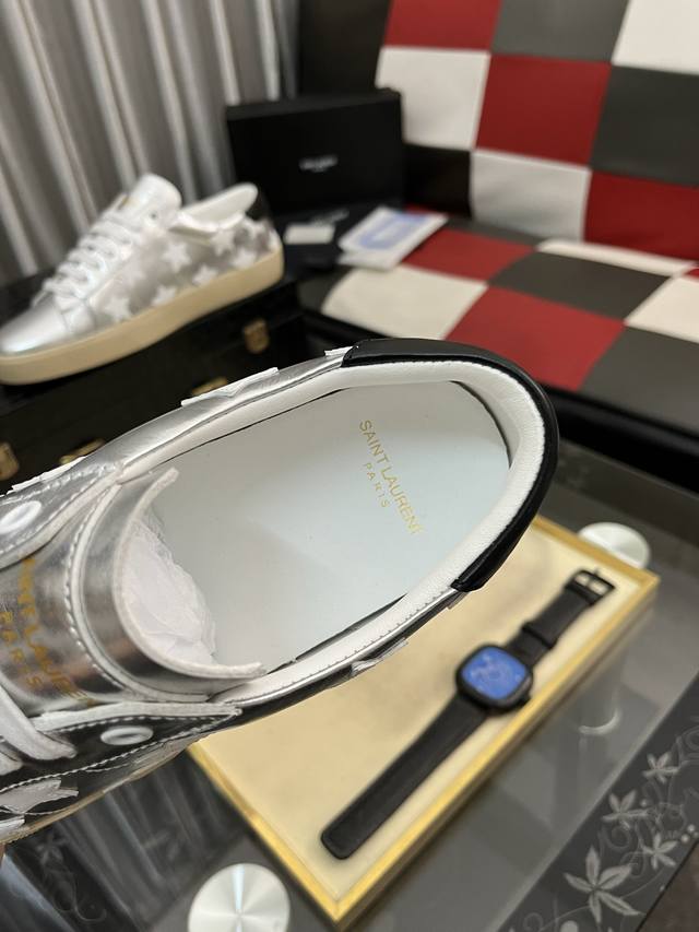 出厂价P Saint Laurent 圣罗兰 -高端品质 原单休闲运动板鞋 -鞋面:纳帕小牛皮打孔工艺、银色牛皮、鞋身.后跟:丝印品牌Logo...