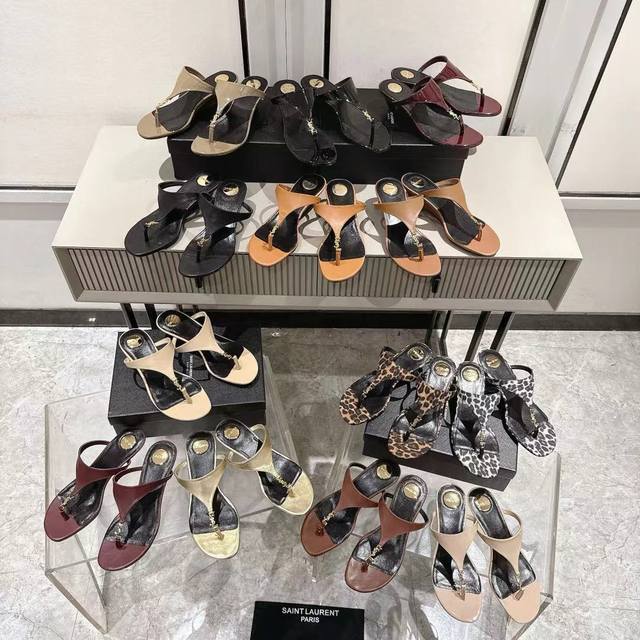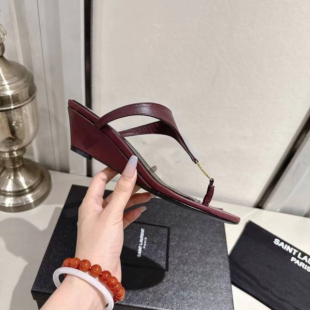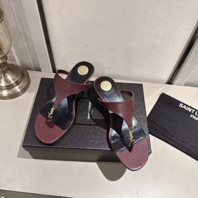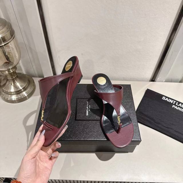 Ysl夹趾坡跟拖鞋2025新版 酒红色牛皮 跟高4.5Cn 码数35-44 35.43.44订做 橡胶大底 真皮大底